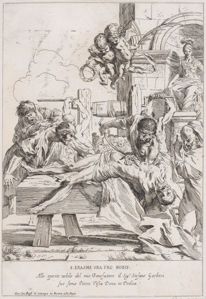 This engraving, “The Martyrdom of Saint Erasmus” by Pietro Testa, presents a scene of brutal suffering rendered in stark lines and dramatic composition. The eye is immediately drawn to the agonized figure of Saint Erasmus, splayed across a wooden structure, as his entrails are wound onto a windlass. Testa's use of line—from the delicate strokes defining the cherubic figures above to the forceful marks detailing the executioners’ grim work—creates a dynamic interplay of light and shadow. This accentuates the horror of the moment, but it also introduces a complex emotional texture. The composition, a carefully constructed arrangement of bodies and architectural elements, evokes the theatricality often found in Baroque art. It is a testament to the power of form to convey both narrative and emotional depth, reflecting the cultural and philosophical tensions of its time. The work functions as a site of ongoing interpretation.