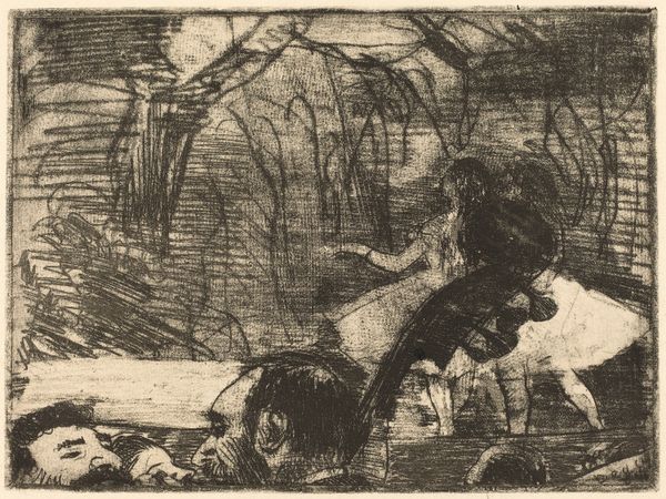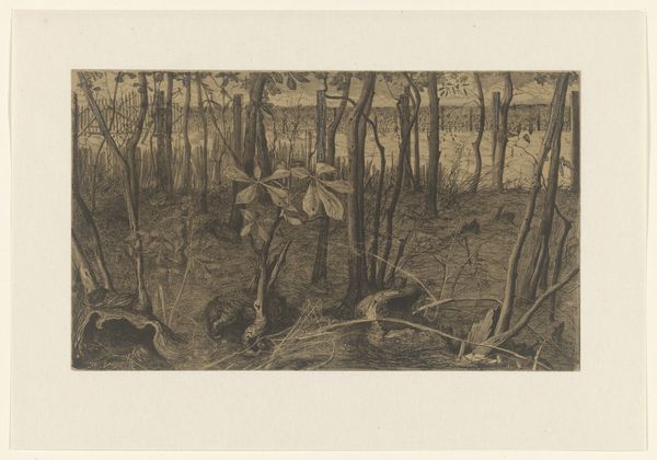 Editor: We’re looking at "The Letter at Camp," an etching by Giovanni Fattori, dating back to about 1893. There’s a real density to it – a lot of detail packed into a small space using line work, particularly in the foreground. What strikes you when you look at it? Curator: The orchestration of the visual elements, I must say, is quite compelling. The stark contrast between the foreground’s intricate network of lines depicting the unruly vegetation and the relatively open middle ground, where we find the soldiers and the tents, creates a spatial dynamic. The horizon almost disappears within the landscape, so we can analyze that, can't we? Editor: Yes, how does that flatness affect the work, would you say? Curator: It throws emphasis back onto the surface, towards the materiality of the piece itself. The landscape almost buckles, folding forward. It begs us to consider the artist's hand, the pressure of the stylus on the plate, the very act of creating this image rather than accepting it as a mere representation. The narrative element, if we can use that, becomes subordinate to the visual construction. Notice how the distribution of the dark values—created through hatching and cross-hatching—creates a rather captivating rhythm. Don’t you agree? Editor: I do! The way he's layered all of the detail is striking, with almost everything in dark ink. It seems to create this sense of intimacy within a landscape setting. I wouldn't have initially noticed that if you hadn't mentioned the contrast between foreground and background. Curator: Precisely. And by isolating these formal choices, we can then infer their potential contribution to any emotional or symbolic content. What initially appeared a simply rendered military scene begins to resonate with layers of meaning precisely because of, not despite, the material properties of ink on paper. Editor: That’s given me a completely new way to appreciate it. Thanks! Curator: My pleasure! I also learned from our discussion today!