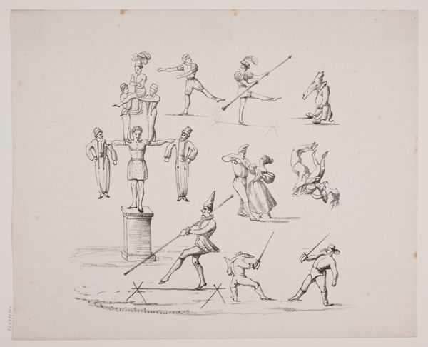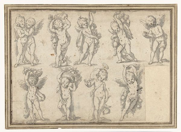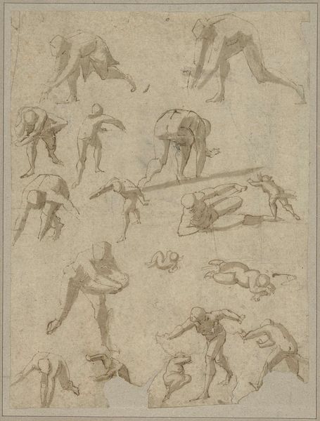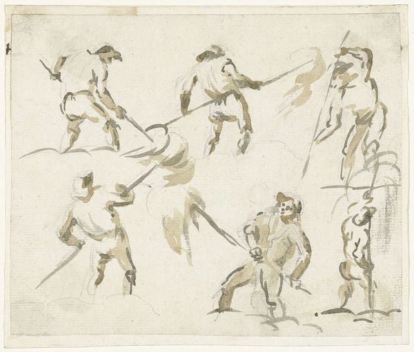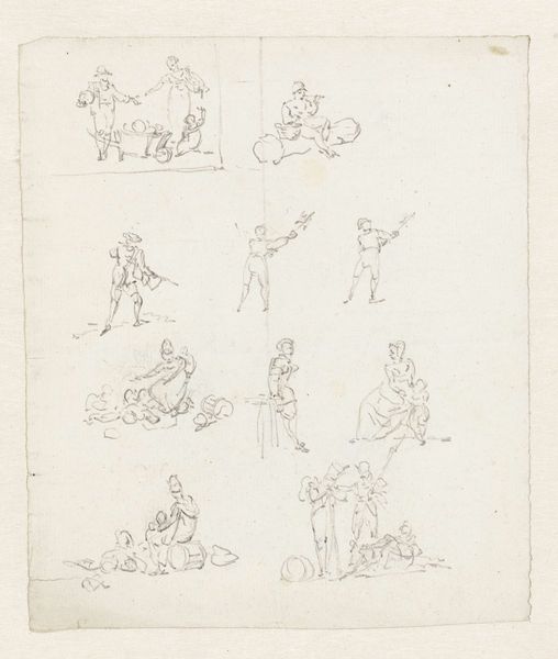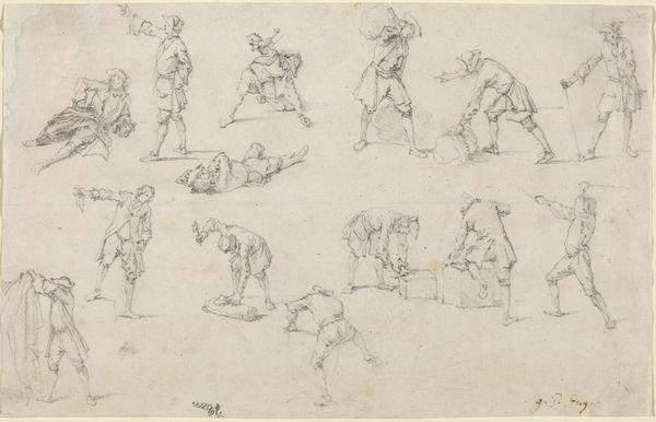 Curator: Georg Philipp Rugendas is the artist behind this drawing, titled "Studieblad met negen figuren," created sometime between 1676 and 1742. The piece, rendered in pencil on paper, features nine figures in various poses, almost like snapshots of a theatrical performance. Editor: It’s interesting; the light touch of the pencil gives the figures an airy, ephemeral quality. It's like glimpsing moments from a dream or a fleeting memory. Each character seems caught in their own world, telling their own silent story. Curator: Absolutely, the drawing itself serves as a study sheet. Examining the historical context, Rugendas likely utilized this to refine his grasp of human form and drapery for larger, more complex history paintings or genre scenes. Think about the narratives popular then—heroic battles, moral allegories—this sheet provides building blocks. How do bodies express tension, victory, weariness? Editor: True. One figure, leaning over, appears to be retrieving something from the ground, while another sprawls out in seeming abandon. They're individuals but placed together they hint at maybe daily struggles. There’s also this implied motion—almost a silent movie reel unspooling before us. I love the lack of rigidity! Curator: These figures aren't idealized; they're workers and everymen. This resonates with the changing social dynamics of the era, where ordinary people increasingly became subjects of artistic inquiry, moving beyond purely religious or aristocratic representation. Note how he used line, minimal shading, but you get dimension in clothes. Editor: I feel drawn to this one figure in the top middle almost reclined as if contemplating something…almost staring into the distance while also gesturing as if they're exclaiming a sudden insight or observation, it really ignites my imagination. Curator: Perhaps contemplating their position, in all its possibilities! The piece becomes an insightful document when you approach this drawing as both a technical exercise and as a register of shifting social values. Editor: It’s incredible how something seemingly so simple, like a pencil drawing of figures, can unlock so many different conversations and narratives within. Now that I look back, it makes me feel excited to start a whole new project. Curator: Precisely, it serves as a powerful reminder of the layered and complex relationships between artistic skill, historical context, and social representation, reminding us to never underestimate what an artwork can convey.