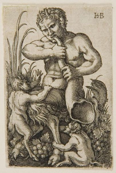 Sebald Beham made this tiny, intricate print, “Satyr blazend op een hoorn,” sometime between 1500 and 1550 using the intaglio process of engraving. Engraving is a skilled, labor-intensive process. The artist carefully incises lines into a metal plate, often copper, using a tool called a burin. The depth and density of these lines determine the darkness of the printed image, which, in this case, creates dramatic tonal contrasts. Look closely at the satyr's muscular form and the lively details of the surrounding flora and fauna. These lines wouldn't be possible without complete mastery of the engraver’s tools. The production of prints like these was central to the art market of Beham's time; they democratized imagery, making it available to a wider audience. By understanding the time and skill involved in creating this small work, we can appreciate the print not just as a picture, but as a testament to the creative labor that made it possible.