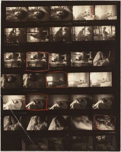 This is a photographic contact sheet by Robert Frank, a sequence of exposures showing the writer Katherine Anne Porter in bed. The material here is crucial: not just the photographic paper, but the film itself, presented as a matrix of images. Frank has drawn on the surface, marking his selection of images for publication. This is a record of a process, not a finished work in itself. Think about the social context. In the mid-20th century, magazines like *Harper's Bazaar* were a primary vehicle for photography. This was applied art, pure and simple, made to the specifications of an editor. But the contact sheet gives us insight into the photographer's method, the way he shoots many frames to get the right image. Frank’s method democratized photography by suggesting the decisive moment comes not from technical skill, but from the brute force of the shot. That is what makes this object so compelling. It collapses any distinction between art and the making of it.