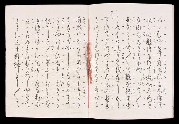 Curator: Here we have "One of Eight Printed Nō Plays published by Kōetsu," created in the Early Edo period, published by Hon'ami Kōetsu. It's an open book, about 24 by 18 centimeters. Editor: It looks remarkably unrestrained; the brushwork has a real energetic flow. I wonder, what was the purpose of production? Curator: These were luxury editions of Noh plays, part of Kōetsu's broader artistic output—linking the high art of calligraphy with popular theatrical forms. The paper itself signifies a certain level of wealth and access to resources. Editor: It's fascinating how this bridges visual art and performance, while also hinting at social stratification via its materiality. It all speaks to an interesting intersection of culture and class. Curator: Absolutely; the form and the content really offer much insight into the social fabric of the era. Editor: Indeed, looking closer, it's quite an intimate glimpse into a specific time and place.