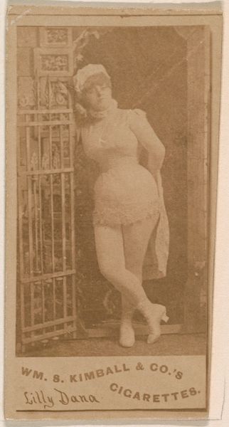 Curator: Here we have a photograph from the late 1870s or early 1880s by Louis-Émile Durandelle, titled "Vloer lantaarn in de vorm van een naakte dame, zij houdt op haar hoofd een kelk vast" — that's "Floor lamp in the shape of a naked lady, she holds a chalice on her head" for our non-Dutch speakers. The work is, fittingly, a study of a bronze sculpture functioning as an ornate floor lamp. Editor: The first word that jumps to mind is "burden." She looks so somber, dutifully carrying this heavy light. Does the illumination she offers justify the… exploitation of her form? Curator: Well, that's an interesting take, particularly as we consider this within the historical context of Neoclassicism and the prevalent Orientalist themes in art at the time. We're seeing the objectification of the female form, sure, but it’s also an example of the industrial arts moving toward mass production—sculptures, once precious, being made for everyday bourgeois consumption. Consider the foundry that produced it; how did those labourers understand the original artistic intention, and did their own investment of physical labor shape its significance? Editor: The photograph itself lends an interesting layer of mediation too, doesn't it? The almost monochromatic quality makes the texture of the bronze palpable but also creates distance. And speaking of burden… do you think it’s possible to look at her offering of light as generous, even transcendent, not merely exploited? What kind of interior space was lit up by such a thing, and was there any beauty in that practical reality? Curator: Perhaps the sculpture’s intent, though, can only be grasped fully when also examined as part of broader visual trends, production processes, and commercial considerations… The interplay between the artist, the craftspeople who realize the artist's design, the vendors selling lamps such as these. These sculptures—especially rendered via photographs—democratized the aesthetic values and tropes of a class… Editor: It's a dizzying piece in some ways, because it pushes and pulls at my empathetic senses so. There's this strange mix of the classical and the frankly, sort of, gaudy... It throws you, doesn’t it? Curator: Indeed. By focusing on the various dimensions of production and social context, we can move toward an insightful comprehension. Editor: A light of surprising density.