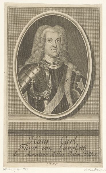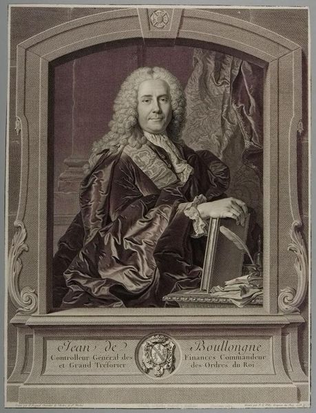 Editor: This is Johann Georg Wille’s portrait of François Louis-Anne de Neufville, Duke of Villeroi. It is a very formal piece. What can you tell me about the cultural significance of portraits like this? Curator: Well, this portrait isn’t just about capturing likeness. Consider the armor, the elaborate wig. These aren’t merely aesthetic choices. They're carefully constructed symbols designed to project power and legitimacy, particularly within the context of the French court and its power structures. Think about the role such images played in shaping public perception and reinforcing social hierarchies. Editor: So, it's about more than just who he was, but what he represented? Curator: Exactly. And the engraving itself, the process of creating and distributing prints like these, speaks volumes about the dissemination of power and influence. Editor: I hadn’t thought about it that way. Thanks for the insight! Curator: My pleasure! Analyzing art through its cultural and political role provides a richer understanding.