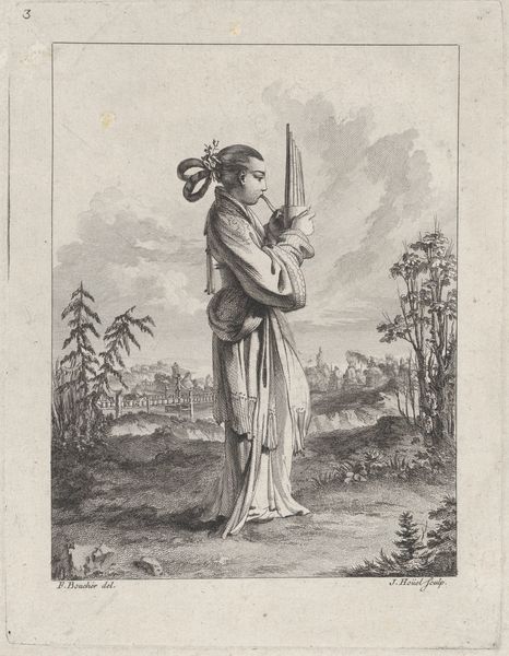 Jean Pierre Louis Laurent Hoüel's "Chinoiserie with a woman playing a musical instrument" captures the 18th-century European fascination with the East. The woman, adorned in fanciful 'Chinese' attire, holds a rectangular instrument pierced with circular openings. This evokes musical harmony and exoticism. Consider how such motifs journey through time. Circular shapes, potent symbols of the cosmos, have echoed through art since antiquity. Think of mandalas in Buddhist art that represent the universe, or the halo in Christian art. The European adaptation presents a re-imagining of this symbol. The distant, idealized East becomes a mirror for European fantasies. It hints at the continuous, subconscious desire to find harmony and balance. This image, like so many others, represents a cyclical return to archetypal symbols that capture our deepest emotions.