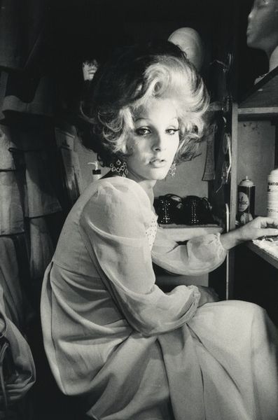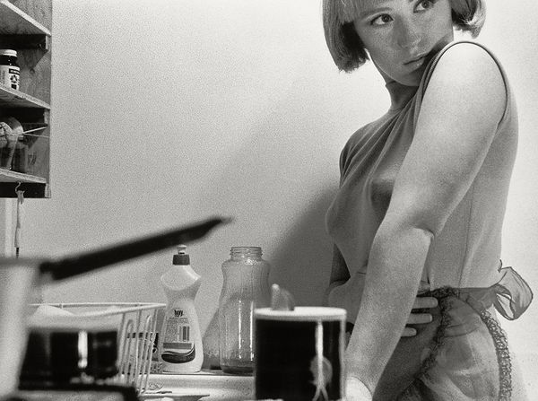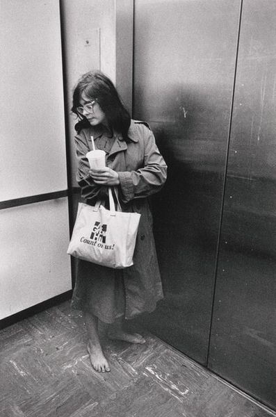 Editor: This gelatin-silver print, "Runaway from Florida Who Stole Her Daddy's Credit Cards" by Jim Goldberg, feels stark. The monochrome tones create this immediate sense of vulnerability around the subject, especially with the suggestive title. What strikes you most when you look at this photograph? Curator: Immediately, the box of Cheerios she holds resonates deeply. Think about it: Here we have this iconic symbol of wholesome, family breakfasts clutched by someone living quite outside that ideal. What do you imagine that juxtaposition tells us? It suggests the yearning for that normalcy, perhaps, even as she deviates from that familiar narrative. Editor: I see what you mean, it's such a powerful contrast! There is so much contained in one shot...do you think that is intended? Curator: Oh, absolutely. The door ajar behind her implies an uncertainty; a liminal space between escape and something more permanent. Consider, too, how the details she wears contrast – the child-like floral pattern with an adult sweater. Goldberg, in his selection of detail, wants to show us a complexity within the human. Editor: It makes me consider the social issues surrounding her position, which seem to add to her overall symbolism as a vulnerable young woman facing hardship... Is this consistent with the other images he makes? Curator: Yes, often. Goldberg is well-regarded for works that grapple with such liminal identities and outsider status. He seeks to unearth truths residing in these fringe narratives. By combining image and text he provides cultural memory and continuity through a psychologically weighted portrait. Editor: It’s really eye-opening to consider the layered symbolism within such a seemingly simple image. Thanks for offering this perspective. Curator: And thank you! Considering art with fresh eyes reveals unexpected emotional and social truths.