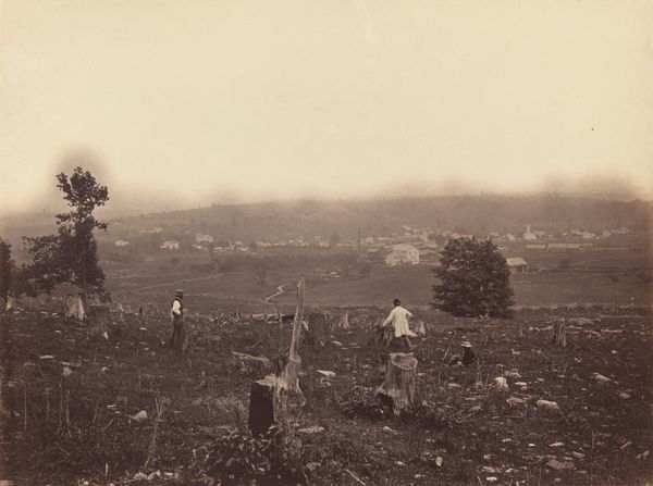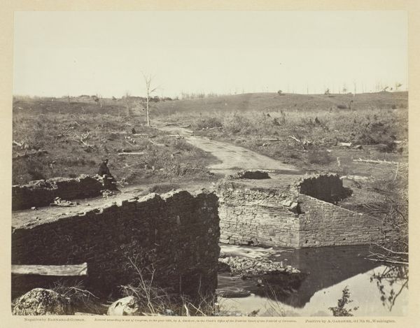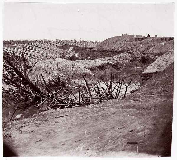 Editor: Here we have George N. Barnard’s "Battlefield in Atlanta," a gelatin silver print from 1864. There’s an eerie stillness to this landscape. It feels like we're looking at a stage after the actors have left, but the set is still standing. What do you see in this piece, particularly regarding its historical and social context? Curator: This photograph operates on multiple levels, doesn't it? Beyond the immediate desolation, it speaks to the devastating consequences of war, specifically the American Civil War, and the deep societal rifts it both exposed and exacerbated. Consider the date – 1864. This was a turning point in the war, particularly known for Sherman's devastating Atlanta Campaign. Can we consider this photograph, then, as evidence, as a stark reminder of the costs of conflict fueled by issues of race and economic injustice? Editor: Absolutely. And seeing the abandoned railway tracks, I can't help but think of the logistical element of war and its disruption of the infrastructure upon which daily life is built. The promise of progress now twisted to serve a purpose of destruction. Curator: Precisely. The railway embodies a broken promise. Progress, yes, but progress benefiting whom and at what cost? Barnard doesn't give us heroic figures or grand narratives, does he? He gives us a landscape stripped bare, a silent witness. This silence becomes a powerful indictment of the narratives that often glorify war, urging us to confront the brutal reality experienced by those marginalized and dispossessed. Editor: It’s a very different perspective than you’d get in a typical history painting of the era. More sobering. Curator: Indeed. Barnard's lens provides a counter-narrative, one that refuses to romanticize war. It challenges us to acknowledge the long shadow cast by such events on communities and individuals. The battle may be over, but the battlefield remains, a constant reminder of unresolved issues, a fertile ground where future conflicts can easily germinate. Editor: I'm struck by how much this image makes you think about power and its consequences. Thank you. Curator: My pleasure. Hopefully, this image becomes a prompt to continually question whose stories are told and, crucially, whose are left out.