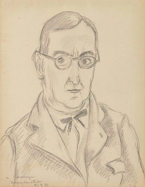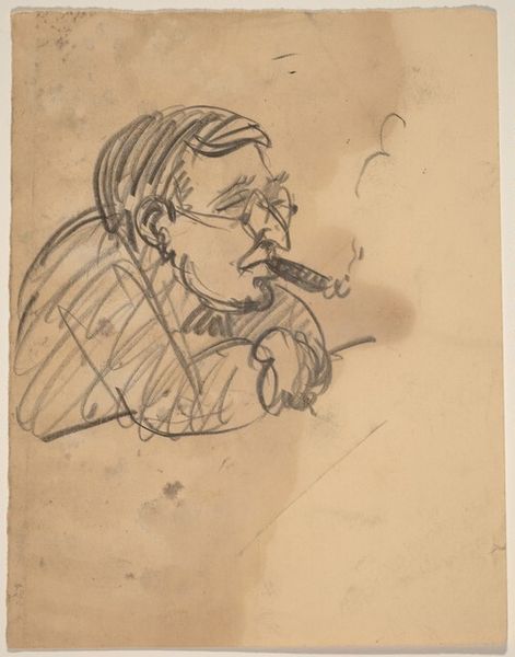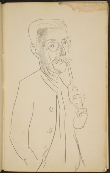 Curator: Raoul Dufy created this portrait of Eugène Montfort between 1929 and 1930, employing the simple yet elegant medium of pencil on paper. Editor: Ah, a smoker! He looks rather pleased with himself, doesn’t he? There’s a whimsy here, the way the lines dance and create a sort of lightness. It feels… intimate, like a stolen glance. Curator: It's fascinating how Dufy distills form to such essential lines. We can see the labor in each deliberate stroke, each contour defining shape and volume, particularly in the jacket's structure. Editor: True, true, but look at the cigarette smoke! It’s not just smoke; it’s like his thoughts curling out of his head. The overall effect borders on caricature but remains genuinely fond, I think. It's got charm! Curator: The linearity is paramount. Notice the construction; the hatching and shading build the subject, a testament to Dufy's skilled handling of such a basic material. It begs the question of mass consumption and the material constraints shaping modern artistic production, actually. Editor: Consumption! Well, yes, he is consuming that cigarette! But more seriously, Dufy’s suggesting a whole life lived—maybe lots of late nights fueled by tobacco, perhaps some existential questioning swirling around with the smoke. Curator: Thinking about how easily pencil is sourced versus paint perhaps helps reframe conversations about the monetary values of different material usages... Editor: Yes, you’ve put a pencil-point on something crucial about artistic economy! As I look again I'm realizing how Dufy gives such dignity to a figure that, done differently, would lend itself more easily to the burlesque or even cruel parody. Curator: Examining the production context, we gain understanding beyond aesthetics and delve into societal dynamics reflected within. Editor: It is incredible the level of humanity a handful of marks can embody, isn’t it? It shows how truly engaging with materiality can illuminate social meaning.