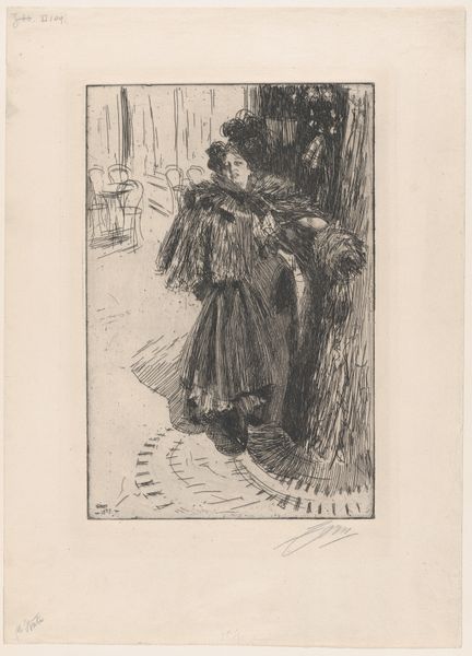 Edgar Degas created this print, "Mary Cassatt at the Louvre: The Etruscan Gallery," using etching and aquatint. The composition centers on two figures in a muted, shadowy gallery. The textures achieved through the etching create a sense of depth and quiet contemplation. The figures, presumably Mary Cassatt and her sister, are placed asymmetrically, disrupting traditional portrait conventions. The woman at the right stands, gazing at the artifacts, while the other sits absorbed in a guidebook. Note how Degas uses line and shadow to explore themes of spectatorship and the act of viewing art itself. The scene challenges fixed meanings of public and private engagement, offering a glimpse into the intellectual and cultural life of women in the late 19th century. Consider the semiotic system here; the museum becomes a space of signs, where art objects and individuals interact in a complex dance of interpretation. This print invites us to question not just what we see, but how we see and understand the world around us. It’s a tableau of modernity, filtered through the artist’s incisive vision.