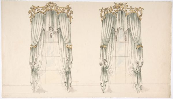 This watercolor sheet features two designs for curtains with pelmets in gold and white. The composition is symmetrical, with each window treatment mirroring the other, which creates a sense of balance and order. The artist’s delicate use of color and fine lines gives the curtains a sense of lightness and transparency, emphasizing the decorative elements and intricate details. The design reflects a specific cultural context where ornamentation signifies status. Here, the gold fringes and ornate pelmets are visual codes that speak to luxury. The design itself is an exercise in controlled aesthetic expression, where the play of light, shadow, and texture aims to convey a particular lifestyle ideal. The artwork engages with the broader discourse of design and its impact on social perception. It invites us to decode the visual cues that reinforce certain values and question how these elements contribute to the construction of identity.
