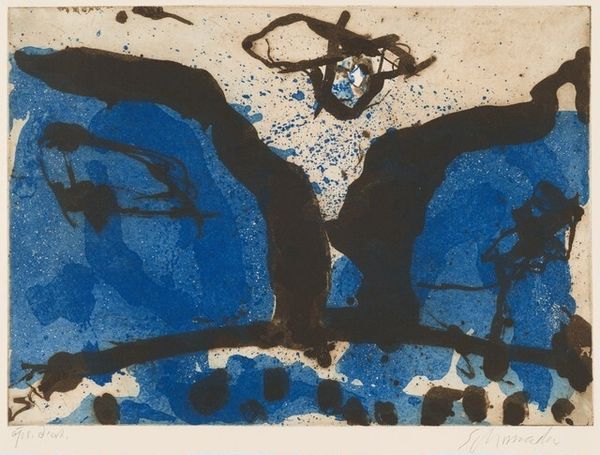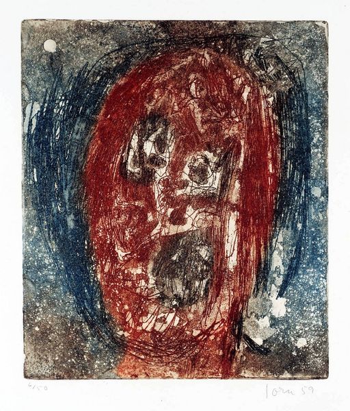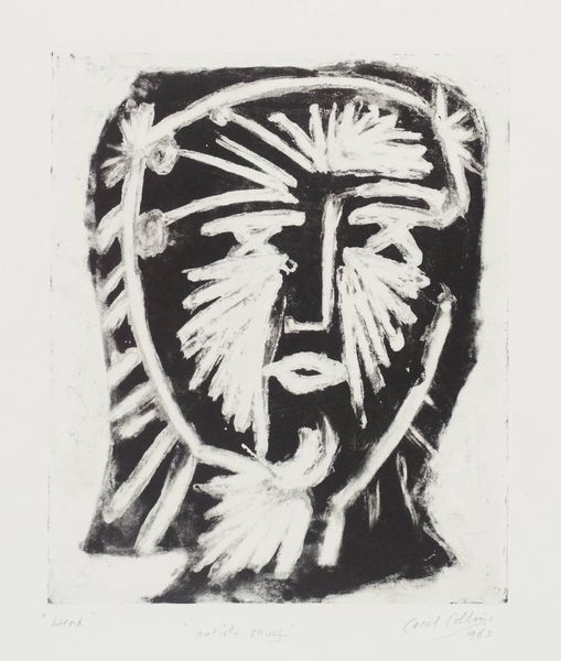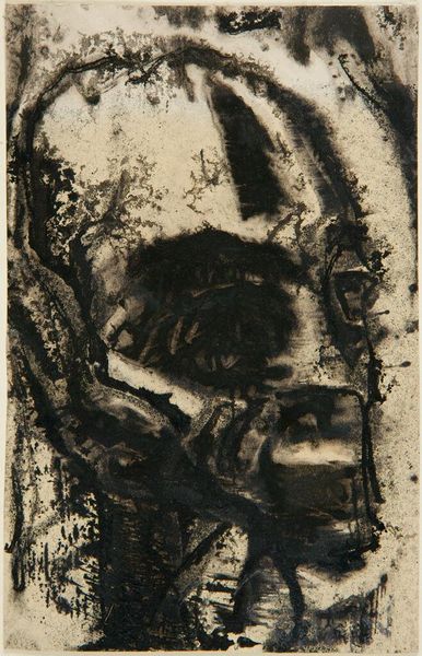 Curator: Here we have Lajos Vajda’s "Masquen," a mixed media drawing on paper. Measuring 260 by 270 millimeters. What’s your first impression? Editor: Chaotic. There's an intentional messiness to the lines, but somehow, amidst the seeming disarray, a face emerges. Curator: Absolutely. It is, on one level, a portrait, but one wrestled from the artist's subconscious. Vajda, active in the interwar period in Hungary, was deeply involved in avant-garde circles, specifically exploring Surrealism. The work has the look of what was referred to as 'naive art' Editor: Yes, the simplification of form strikes me. We have these geometric elements clashing with softer lines. It's intriguing how Vajda plays with visual contrast, this is enhanced through his limited, contrasting palette of black, orange, and white. Curator: The socio-political landscape in Hungary at that time—particularly the rise of right-wing extremism and growing anxieties—must have significantly influenced his move toward the subconscious. The 'mask' in the title "Masquen" becomes interesting in this light, is the art acting as the real identity, is he being true, in art only? Editor: "Masquen" works formally through its ambiguous space. Is it concave or convex? Are we looking at something projecting outward, or receding? It defies simple readings, compelling us to confront its strangeness. Curator: And thinking of how art operates in the public sphere, Vajda challenges any simplistic view of Hungarian identity at this tumultuous point in European history. This drawing, which looks rather unassuming at first, becomes charged with political and social tension, revealing more than initially meets the eye. Editor: A small, quiet explosion of form and content. Curator: Indeed, a fascinating piece that brings into focus how abstract visual language intersects with identity and public consciousness.
