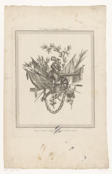 Curator: Oh, my! What a curious, whimsical assemblage. It has such an oddly cheerful affect. Editor: Indeed! What we have here is "Trophy with Horticultural Attributes," a mixed-media print dating back to 1778, etched and engraved by Etienne Claude Voysard. It resides here at the Rijksmuseum. Curator: "Trophy" seems a rather...strong word for what looks like a gentle, almost playful arrangement of gardening tools. Why a "trophy," do you think? It reminds me of how during that period, elaborate displays and representations of the natural world were often markers of wealth and status, demonstrating control over nature. The elite often commissioned such displays. Editor: Precisely! This image is a perfect study of materiality and context. Observe how Voysard meticulously rendered the tools--the rake, the wheelbarrow, even the tiny ladder. These aren't merely representational; they speak volumes about the material processes, the labour involved in cultivating a garden. Curator: I can see how this "still life" romanticizes agrarian life but in a very constructed way. The items are suspended almost as if staged. Notice how gendered the tools feel... or rather, don’t. Absent is the evidence of labor-- no calloused hands, tilled earth, only objects posed formally amidst blossoms and ornament. Editor: Interesting point about the absence of direct labour in the imagery. To your prior point on wealth, though: the engraving technique itself adds another layer. The meticulous detail of the etching showcases the engraver's skill, making the print itself a commodity and statement of value through artistic means. Think about the socio-economic conditions required to have access to materials, time and mastery necessary for its creation. Curator: Right. By stripping bare the grit of labor from these domestic tools, Voysard speaks instead to how society values cultivation without really digging deep. The “trophy” signifies both mastery of the land and this sort of social artifice surrounding idealized country life, and its class-bound accessibility. Editor: Yes! And by recognizing how materiality meets those socioeconomic conditions, this beautiful yet oddly detached image resonates deeply. The art lies, therefore, in both the labor involved in depicting labour, and its accessibility in print form. Curator: A fascinating intersection, indeed! Now, to the next exhibit... Editor: Absolutely! There’s so much more to discuss along those lines...