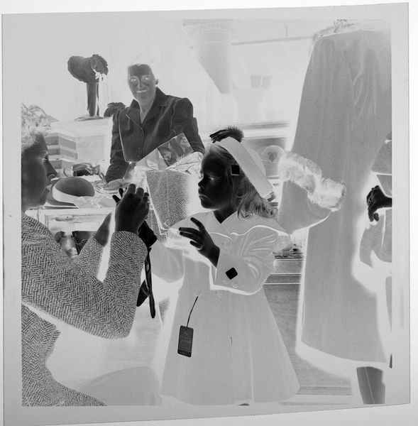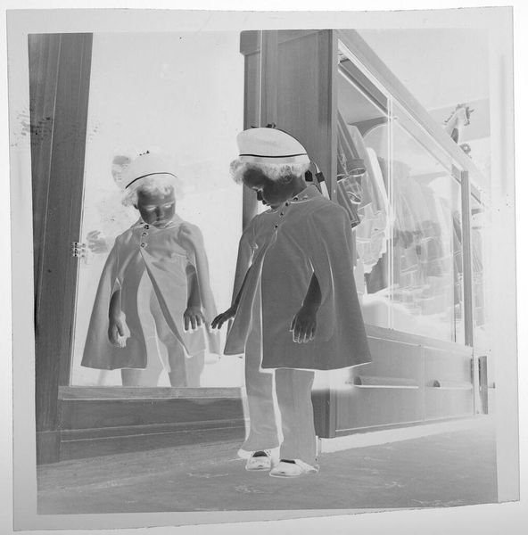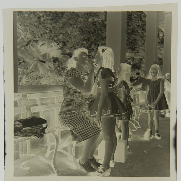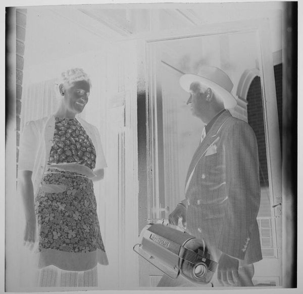 Curator: This is an untitled photograph by Jack Gould, presenting a seated man and a standing woman. Editor: The high contrast in the image gives a sense of timelessness, like a memory surfacing from decades past. Curator: Indeed. Notice how the sharp lines of the architecture contrast with the softer focus on the figures. The composition seems carefully arranged, almost like a stage set. Editor: I agree. There's a tension in their poses. The woman's stance, hands on hips, suggests confidence, while the man seated seems to be looking up at her with a sense of longing or possibly concern. Curator: The negative space surrounding the subjects amplifies the emotional distance. It’s a study in light and shadow, creating a visual narrative. Editor: It certainly evokes a sense of curiosity. What are they thinking, what are they about to say? I feel drawn to it. Curator: I find myself captivated by the composition and formal qualities in this piece. Editor: And I, by the narrative it hints at, the unspoken stories it carries.