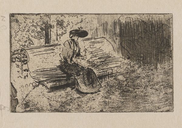 Curator: Upon viewing, the density of the cross-hatching strikes me first. It feels almost claustrophobic despite the outdoor setting. Editor: We are looking at "On the Grass", an etching by James Tissot from around 1880. The scene depicts two women relaxing in a garden. Tissot, as always, delivers a strong narrative thread. Curator: The women certainly convey something about leisure and privilege. Note the parasols, symbols of status shielding them from the sun’s common touch. This resonates with broader social narratives about idealized femininity and societal expectations. Editor: True. And structurally, the parasols echo the lines of the pergola, almost mirroring its constructed shade, which adds another layer of formal repetition within the composition, wouldn’t you say? Curator: I find the figure sitting upright, in her darker clothing, seems like a guardian figure; even the parasol being angled up is in line with the posture. Editor: Agreed. The artist also uses that dark dress as the dominant value, which pulls our focus more effectively. Notice, too, how Tissot uses the textural variation in the etching to suggest differences between skin and textiles, the plush rug, the grassy lawn—it’s quite meticulous. Curator: Yes, it is also a commentary on societal artifice itself. Even nature feels manicured, contained within the borders of wealth and presentation. And, indeed, there seems something unsettling, even mournful in the rigid poses. Editor: Perhaps. From a more objective standpoint, though, this artwork reminds me that we shouldn't shy away from a complex understanding of lines and composition in Tissot. Curator: It’s as if a snapshot has been captured of a past reality, and our response is one of recognition and consideration. Editor: Right. Well, on that pensive note, I guess it's time to move on to the next exhibit.
