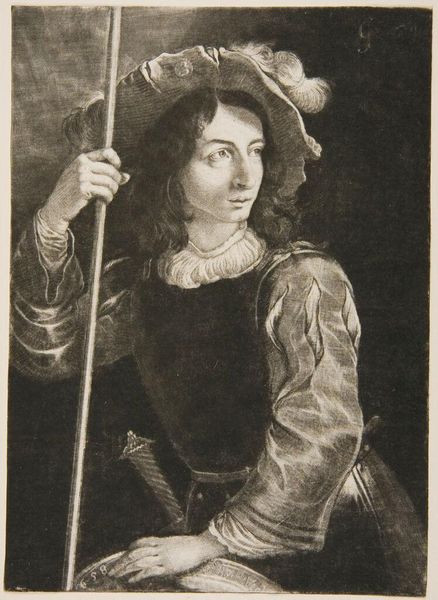 Curator: We are looking at Jan Matejko's "Jan Olbracht," created in 1891. The artwork, executed in graphite and charcoal, is a striking portrait drawing. Editor: It has such an intense, almost brooding presence. The texture achieved with the charcoal and graphite gives the impression of fur, depth, and even a hint of melancholy. Curator: Indeed, Matejko’s choice of medium speaks volumes. The use of graphite and charcoal allows for a range of tones, mirroring the era of significant industrial developments that provided accessibility and scalability of these materials as important social records. His skillful handling conveys a sense of raw immediacy while reflecting on historical and contemporary themes. Editor: Consider the figure’s pose: one hand is visible with his thumb resting on what is clearly the handle of his sword. It creates a visual tension with the figure and his stance as a protector, one not willing to surrender. The hatching and cross-hatching generate an intricate play of light and shadow which add dimension to the textures and overall composition of the portrait. Curator: From a historical context, the sword acts as a symbol of authority and power during Olbracht's reign as King of Poland. We can draw interesting links between the symbolic value of that piece of metalwork in the hand and broader networks of production, trade, and consumption of prestige objects throughout the Polish Renaissance. The clothing also gives clues about class, labor, and position. Editor: It’s fascinating how Matejko guides our eye. I keep returning to Olbracht’s gaze –direct, engaging and rather penetrating. Curator: The materiality combined with representation creates tension here; through line and shading the artist makes a statement about national identity by connecting history to the social and economic conditions of his time. Editor: And it is precisely within the lines, in the gradations of tone, that we begin to discern so much character of Matejko's historical representation. A remarkable dialogue between form and history. Curator: An exchange through the hand of the artist who masterfully employs tools to not only form likeness but reveal broader societal dimensions. Editor: Quite right.