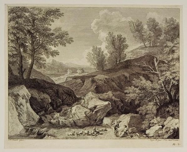 Curator: Let’s turn our attention to Etienne Baudet’s "Landscape with Orpheus and Euridice," held here at the Harvard Art Museums. The plate measures roughly 58 by 76 centimeters. Editor: Oh, what a beautifully melancholic scene! The sepia tones give it such a dreamlike quality, like a memory fading at the edges. Curator: Indeed. Baudet, who lived from 1638 to 1711, was a skilled engraver. This work showcases the labor-intensive process of creating detailed tonal variations through etching and engraving techniques. Editor: You know, looking at Orpheus there, lyre in hand, I can almost hear the mournful tune he's playing for his lost love. It makes you think about the fragility of beauty, doesn’t it? Curator: It’s interesting to consider how such prints circulated widely, impacting taste and acting almost as a form of early mass media, shaping perceptions of classical mythology and landscape. Editor: And yet, even knowing that, it doesn’t diminish the emotional power. To me, the landscape itself feels like a character, bearing witness to human tragedy. Curator: Absolutely. It's a testament to how the material reality of art production can still generate potent narratives. Editor: So true. A beautiful reminder of the stories embedded within the medium itself.