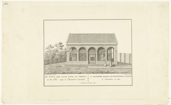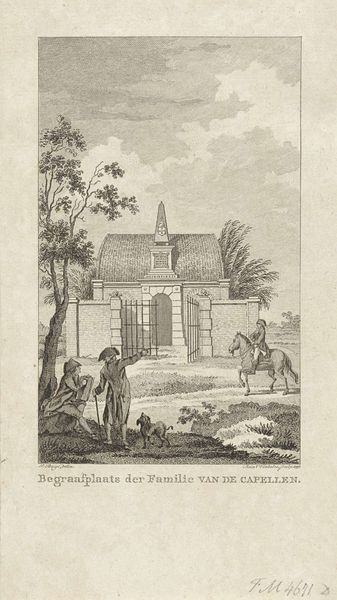 Curator: Here we have a work entitled "Landschap met graftombe van familie Van der Capellen, 1785," created somewhere between 1785 and 1787. It resides here at the Rijksmuseum, rendered as an engraving. What strikes you first? Editor: Bleak grandeur. That's what springs to mind. It's somber, yet the figures, those tiny people almost dwarfed by the gates and structure behind them, give it a peculiar, living quality. Like witnessing a ghost story unfold. Curator: It’s a fascinating example of neoclassicism— the movement was all about reviving those grand, stoic forms of classical antiquity, right? But blended with something that feels uniquely… Dutch. The landscape isn't romanticized; it has a kind of quiet pragmatism. Editor: Exactly! The architecture itself feels monumental, heavy with history, almost as if weighed down by all those family secrets. Do you think it romanticizes death? Curator: It definitely idealizes a certain kind of familial legacy, one rooted in land and lineage. Though neoclassicism often carries a detached emotional tone, here, in its juxtaposition with such intimate themes of death and legacy, there is also room for personal contemplation. Even melancholia? Editor: Perhaps. I am sensing a kind of pride... and maybe loss. It is really difficult to determine the full intentions within this sort of imagery. The composition of this piece guides your eye meticulously across its entire frame, highlighting an intimate human touch that is very endearing. Curator: Yes! Jonxis’s technique in the engraving truly captures an amazing depth. It emphasizes those textures beautifully. The stark lines accentuate the stillness, but it's like the stillness right before something happens. Fascinating isn't it, how art, even the static kind, keeps on stirring! Editor: Very much so. Art always has something to say to us. It speaks in echoes that resonate even now. This landscape, so precisely crafted, somehow still whispers stories across the centuries.