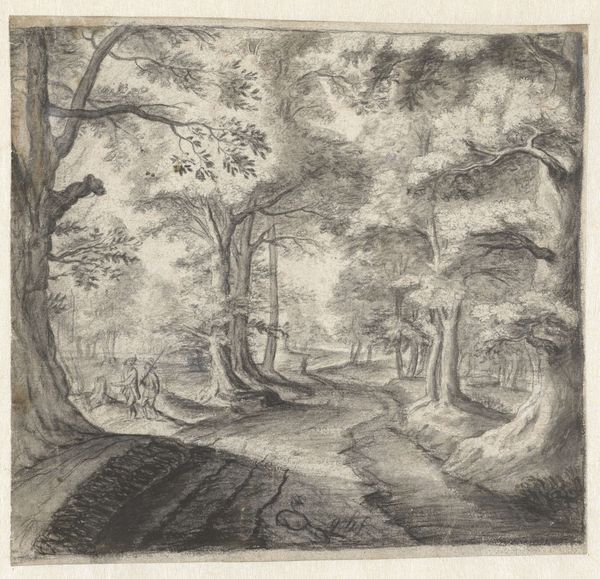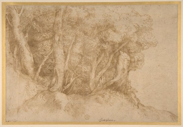 Curator: Today, we are looking at "Near the Woods, Veronne" by Alphonse Legros. It’s an etching. What’s your immediate response to it? Editor: Hmm, I find it quite stark, almost melancholic. There's something about the density of the lines that suggests a sort of barrier, a feeling of being closed in, even in a landscape. Curator: Indeed. Legros, during his time, was quite invested in printmaking. If you look closely, you can appreciate how the medium—etching—allowed him to produce intricate lines and textures, capturing the density of the woods. It involved applying a waxy ground to a metal plate, drawing through it to expose the metal, and then etching the plate with acid before printing. Editor: The visible labor in the linework is palpable. You can almost feel the artist's hand as he worked to carve those details. I'm wondering about the lack of human presence here. The woods feel like a stage without actors, ripe for potential stories and narratives about our complicated relationship with nature. Curator: That's insightful. The image also reminds us of the role of printmaking during periods of social upheaval, where multiple copies allowed for broader dissemination of images and ideas, breaking away from the exclusive, aristocratic tradition of painting. Editor: And the composition is striking too; how the light seems to be obscured, barely cutting through the thick foliage. I can’t help but read it as an allegory, potentially reflecting the oppressive realities faced by many at the time, especially those marginalized. Nature often mirrors the social landscapes. Curator: Certainly. His exploration of the material process allowed artists to distribute artwork more democratically, thus allowing artwork to move out of bourgeois drawing rooms. The means of production and consumption are as integral to our understanding as any symbol depicted within. Editor: This piece makes me think about our current climate crisis and environmental exploitation. Are we any closer to understanding and respecting nature, or do the woods still represent an area we exploit to our advantage? Curator: The artwork offers ample opportunities for thought. Editor: A sober, sobering reflection indeed, making visible social themes that linger just beneath the surface.