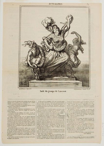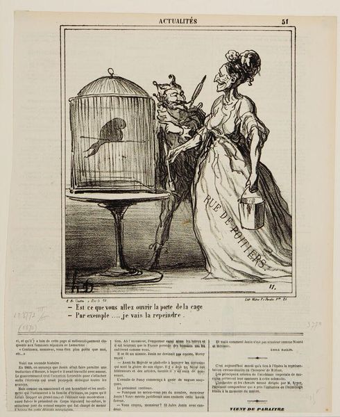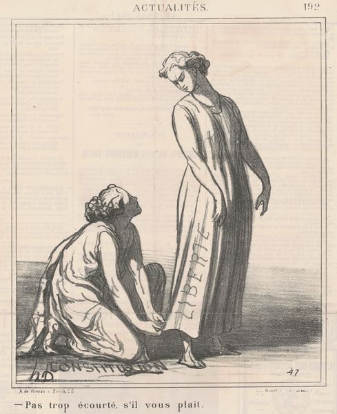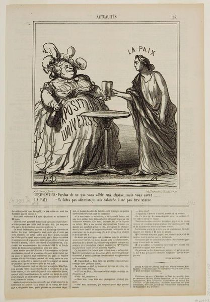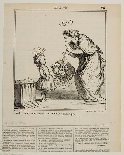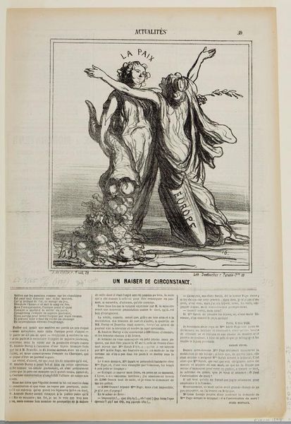 Curator: Daumier’s lithograph, "First Prize for Growth—Prussia," presents us with a stark image from 1867. What's your immediate reaction? Editor: Foreboding. The lines are sharp, almost cruel, and the scene feels heavy with a forced submission. Curator: Precisely. Here, Prussia, draped in a cloth bearing its name, bows to a figure of France, who offers a crown. The year "1867" adorns her shield, hinting at France's role. Editor: The crown reads as a symbol of hollow victory. The exchange seems less about reward and more about France attempting to control Prussia's rising power. The figures behind them are indistinct but clearly present. Curator: That crowd indicates wider social and political dimensions. Daumier's image speaks volumes about the anxieties surrounding power dynamics, identity, and national aspirations in 19th-century Europe. Editor: Ultimately, this piece serves as a potent reminder that symbols can obscure as much as they reveal, demanding careful contextual understanding. Curator: Indeed.