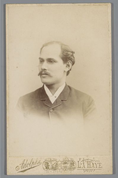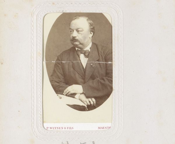 Curator: This photograph captures Johan Philip van der Kellen, director of the Rijksprentenkabinet, sometime between 1870 and 1890. It is an albumen print. Editor: The first thing I notice is its unassuming simplicity. It feels like a very personal object, something meant to be kept close. I am interested in the production techniques to achieve this effect. Curator: The albumen print was a popular method at the time. Think of it: coating paper with egg whites before adding the silver nitrate. The process, labor-intensive and chemically driven, speaks volumes about the era’s intersection of science and art. And look closely – can you see any signs of manipulation of the print itself? Editor: Definitely. We are not merely observing van der Kellen as an individual, but the construct of him in his official role within an established, revered institution. The controlled pose, the respectable suit, even the subtle backdrop—everything reinforces his position within the cultural hierarchy of the late 19th century. Curator: Right, and this "Carte de Visite", produced by A. Cucumus & Cie. and preserved at the Rijksmuseum, illustrates the dissemination of imagery and power through material objects. It is fascinating how a piece of photographic paper serves a cultural function. Editor: Consider its display context: this photograph circulated amongst other images of similar status figures, impacting visual culture of the time. Did such controlled photographic portrayals cement perceptions or provide grounds for resistance? Curator: Well, I suppose that brings up another interesting point: was Van der Kellen attempting to reinforce existing social hierarchies, or was he simply acting within the confines of accepted practice at the time? Editor: Yes, exactly. It’s a beautiful thing to consider, this intersection of artistic technique and cultural expression frozen within this humble photograph. Curator: Absolutely. Analyzing the construction of such historical depictions deepens our knowledge of how individuals engaged in broader cultural, financial, and political landscapes.