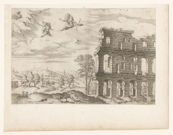 This is F.C. Scholten’s etching, "Et slot", made around 1742. The scene unfolds in a series of receding planes, using line and form to create depth. The architecture, with its ordered windows, stands in contrast to the organic shapes of the trees and billowing clouds. The composition is divided, the severe lines of the building on the left juxtaposed with the open, cultivated fields on the right, creating a dialogue between order and nature. Linear perspective draws the eye into the landscape, where figures are at work, adding a layer of narrative. The heavy sky, rendered with dense hatching, presses down, creating a sense of drama. Consider how Scholten employs line, not just to depict form, but to create texture and atmosphere. The etching is not merely a representation of a place, but an exploration of space and the relationship between human structure and the natural world. This exploration invites us to contemplate our own place within these contrasting elements.
