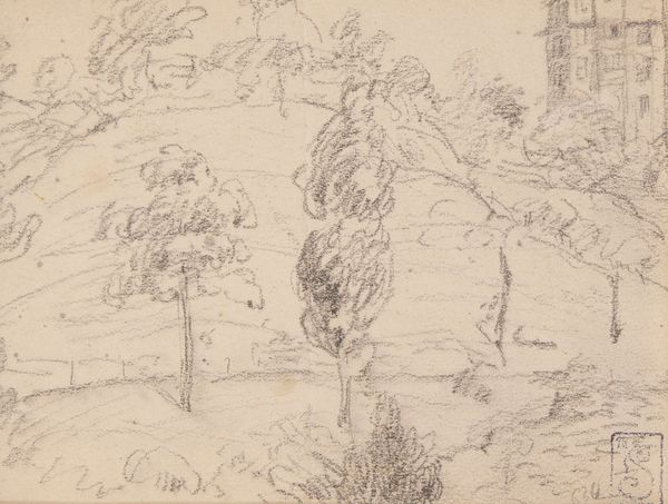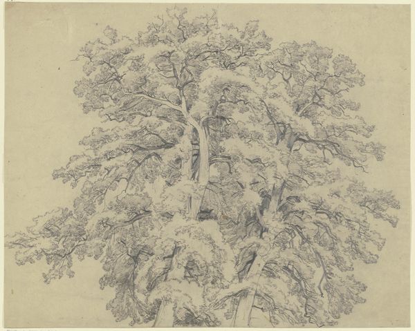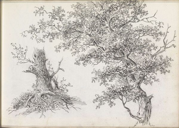 Editor: This drawing, titled "Study of Trees," is by James Ward. It seems to be a pencil drawing, maybe even an etching. The line work is incredible. There’s something so delicate and intricate about it. How would you describe the composition, especially its lines and values? Curator: The beauty of this study lies in its formal elements, its manipulation of line and value to create a compelling visual structure. Observe the deliberate, almost calligraphic quality of the lines. How they vary in weight and direction, mapping the volume and texture of the trees. Editor: Right, the varying line weight makes a huge difference. I can really see the bark texture and the depth of the leaves because of that contrast. Curator: Indeed. And what about the interplay of light and shadow? Notice how Ward uses hatching and cross-hatching to model form, creating a sense of depth and atmosphere. The artist carefully distributes the darker and lighter values, isn't it? Where does your eye travel within the composition? Editor: Definitely upwards. From the solid dark trunk on the left to the light, airy branches above, my eye is drawn upward. The contrast there is pretty dramatic. I like the dynamic diagonal created by the trees bending left. Curator: Precisely. This dynamic interplay reveals an aesthetic system which draws our eyes upwards. Ward has clearly mastered the craft of composition, organizing line and light to emphasize depth and dynamism in the plain drawing surface. Editor: It’s amazing how much depth and texture he achieves using just pencil lines. Thank you. I see so much more of its underlying structure now. Curator: You're most welcome. This close attention to form can open new avenues for appreciation, hopefully even to your own works.