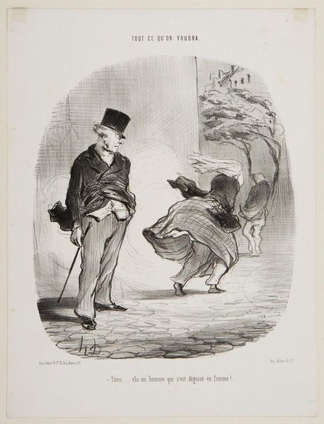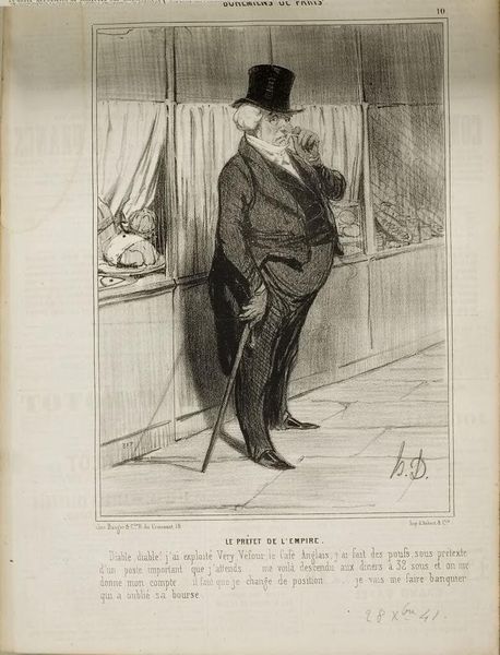 Curator: Look at this lithograph, "The Businessman" by Honoré Daumier. The Harvard Art Museums hold this glimpse into 19th-century Paris. It immediately strikes me as frantic, almost Chaplin-esque in its energy. Editor: Absolutely, and the frantic energy is key. Notice the inscription "Justice de Paix" on the door he's rushing towards. Daumier’s using satire to critique the social structures of the time. Who truly has access to justice? Curator: It’s a pointed question, isn't it? The man, ostensibly respectable in his top hat, is rendered almost absurd by his haste, his spindly limbs. There's a palpable tension between appearance and reality. Editor: Exactly, and consider the caption! The businessman is dealing with a petty case—a grocer and hidden money. The image critiques class and access to legal recourse, reflecting broader power dynamics. Curator: Daumier’s talent was in capturing those little moments that expose bigger truths. It makes you wonder what was lost in translation. Editor: For sure, Daumier's brilliance lies in holding up a mirror to society’s hypocrisies. I think it speaks volumes about how we still grapple with similar issues today.
