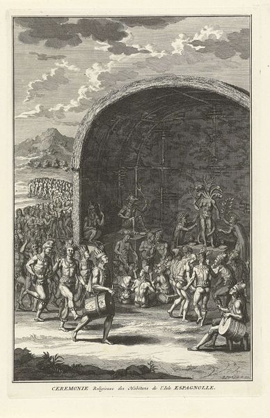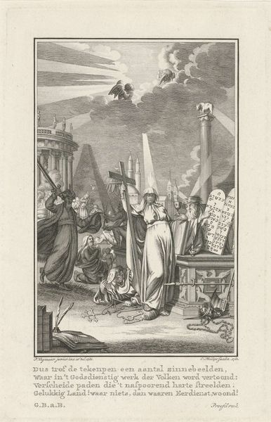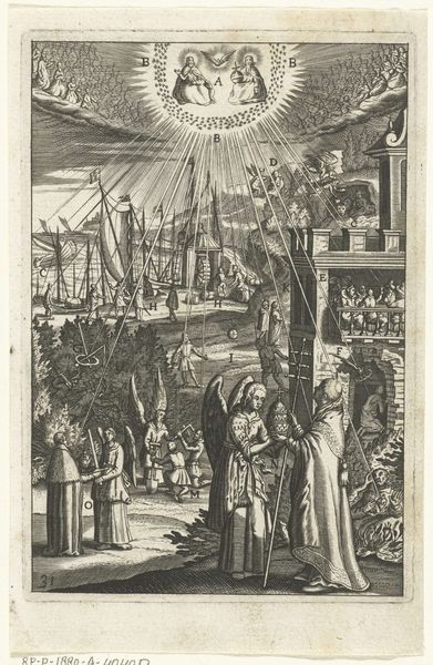 Curator: This engraving, crafted sometime between 1620 and 1649 by an anonymous artist, is held here at the Rijksmuseum and is titled, "Emblem with men painting portraits of saints in order to follow their example." The title itself gives insight into the overall composition and message. Editor: The allegorical nature immediately strikes me, it’s like a dreamscape filled with ethereal light and earthly struggles all in one contained composition. The line work alone has such expressive detail. Curator: Absolutely. Looking closely, we can analyze the various levels. At the base, a man is being ridden by some sort of demonic figure while the painter looks to emulate holiness through replication, observed by a crowd of monks in prayer to their saintly forebears above who have divine sanction, illuminated from on high. Editor: The semiotics are complex, indeed. The placement of each element relative to the others clearly intends a narrative of artistic practice versus the profane. Notice the artist's focused gaze as he paints, a stark contrast to the contorted figure below burdened by a demonic weight. How this all communicates through line and value is nothing short of a masterclass. Curator: I am fascinated by the presence of established religious hierarchy and institutions standing together to act as divine intermediaries who guide men towards a better world. It shows a sort of optimistic political ideology reflected in art that must’ve been relevant. Editor: Indeed, the engraver cleverly uses depth of field by layering each element with its level of significance while playing on contrasts – light and dark, earthly and divine – the symbolism is powerfully wrought. The composition’s lines seem to act like spotlights shining on key concepts and relationships within this world. Curator: For me, knowing that pieces like these had sociopolitical purpose makes seeing all the careful formal considerations feel a little more meaningful and worthwhile. Editor: Indeed, seeing art historical contexts woven into such fine material composition only elevates its value, and is something that continues to draw audiences today.
