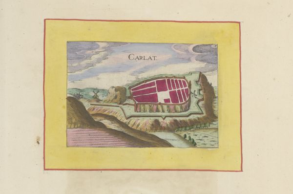 Editor: Here we have an anonymous watercolor drawing entitled "Gezicht op Saverdun," dating back to 1638. The pastel hues create a somewhat dreamy effect. What do you see in this piece? Curator: I see a convergence of military strategy, urban representation, and artistic expression. The bird's-eye perspective emphasizes the fortified walls of Saverdun, hinting at the turbulent political landscape of 17th-century Europe. It makes me think about how cities were visualizing power and defense at the time. Is this a portrait of military prowess? Editor: It’s interesting that you mention the political landscape. The soft watercolors contrast so sharply with what one might expect of a "military portrait," though. It's so gentle! Curator: The gentleness could be deceptive. It might be the artist's strategy of idealization or promotion to elicit soft power. Think about who would have been commissioning such images and what purposes they served. The city could also be portrayed in order to invite trade or new citizens. Was this work meant for public display or for private, strategic planning? Editor: I didn't consider the different intentions behind the piece, that there could be so much to unpack in this calm scene. Curator: Precisely. Considering the public role of art, and the politics of imagery, we can perceive the drawing beyond its initial aesthetic charm and dive deeper into its intended purpose. Editor: This piece really makes you question the narratives being presented to the public, or specific political bodies, back then! Curator: Absolutely, that's the beautiful and daunting role that art fulfills.