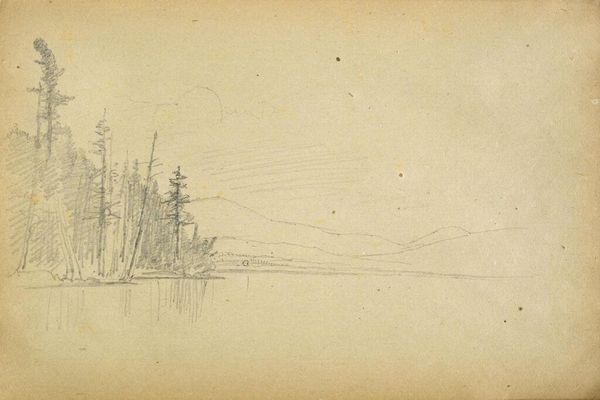 Curator: Here we have Benjamin Champney's "Water Scene," a small sketch. It's quite minimal, rendered in pencil. I wonder what stands out to you? Editor: The immediate impression is one of stillness, almost melancholy. The muted tones and sparse lines create a sense of quiet isolation, a lonely place in time. Curator: Champney was part of the White Mountain School, known for idealizing landscapes. But here, the starkness feels…unfinished, less romantic. Perhaps a study in preparation? The paper's texture itself plays a role. Editor: Absolutely. The rough paper stock, its very fiber, speaks to a work in progress, a direct connection to the artist's hand and the immediacy of capturing a fleeting moment in nature. The economic constraints, or even simply the accessibility of materials, shaped this piece. Curator: It could represent something beyond the surface, a search for deeper meaning, even in these simple forms. Editor: Perhaps. Or, simply, a record of a place, shaped by available resources. Curator: A useful tension, wouldn't you say, between raw material and symbolic resonance? Editor: Indeed, each informs the other.