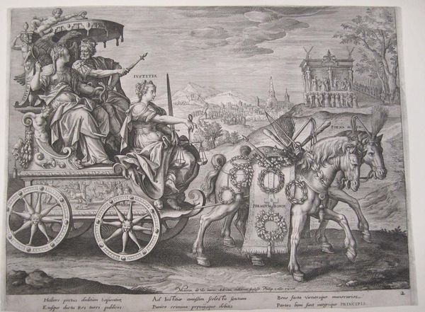 Here we see Servatius Raeven’s intricate engraving, "Wisdom together with Justice and a King on a Triumphal Chariot". The composition is dominated by a chariot, meticulously detailed with figures and symbols, drawn by horses and set against a landscape filled with architectural structures and crowds. The complex arrangement presents a visual hierarchy which invites us to decode its symbolic language. The structural clarity with which Raeven arranges the chariot and its figures allows a semiotic reading of power, law, and knowledge. Justice, with her scales and sword, embodies the balance and execution of law. The king, positioned alongside Wisdom, indicates a divinely sanctioned authority. This construct suggests an ideal state where governance is rooted in justice and tempered by wisdom. The image is not merely descriptive, but prescriptive, advocating for a world ordered by reason and law. This engraving challenges us to consider how power is visualized, legitimized, and communicated through art.