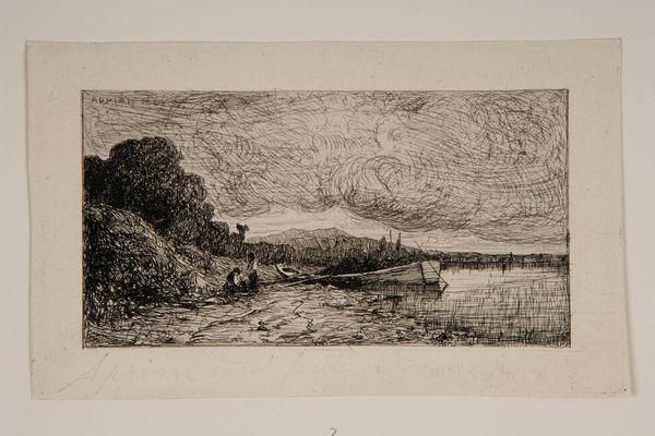 Editor: Here we have Adolphe Appian's "Barge on the Bank of a River," an etching from 1865 currently housed in the Metropolitan Museum of Art. It’s predominantly greyscale, quite small, and moody. The heavy sky makes me feel a bit melancholic. What feelings or ideas does it evoke in you? Curator: Ah, yes. It feels to me like a scene observed on a quiet, reflective afternoon. Appian masterfully captures the stillness, doesn't he? There's a personal resonance here; I remember many afternoons by the Rhône as a child, sketching the play of light on water, not entirely dissimilar to the effect Appian achieves. The textures created by the etching… rough banks meet that shimmering, almost liquid sky. Look closely; do you notice how the clouds seem to echo the ripples in the water? What sort of a dialogue does this create for you? Editor: I hadn’t noticed the mirroring. It creates a feeling of being enveloped by nature. Was Appian trying to say something specific about humanity’s place within it, maybe our smallness against a vast nature? Curator: Perhaps, but I think his primary concern was to capture a sensory impression. You feel the humidity in the air, perhaps hear the gentle lapping of the water against the barge. It’s less a grand statement and more of a shared experience, a fleeting moment captured and immortalized through ink. What do you make of his choice to focus on an everyday subject such as this? Editor: I guess it shows beauty can be found in simplicity. I was so caught up with the artist needing to create some sort of monumental, larger than life creation, and, to the contrary, he celebrates something mundane. It reminds me to pay attention to little details in life, something I often overlook. Curator: Precisely! It’s a gentle reminder. Art isn’t always about the epic; it’s about truly *seeing* the world around us. And sometimes, the barge is more revealing than the boatload!