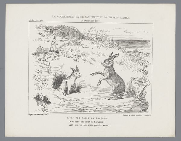 Editor: Here we have Johan Michael Schmidt Crans' "Spotprent op het voorstel ter verandering van de jachtwet, 1873," a print with pen and ink, seemingly illustrating some kind of meeting. There’s a strange, slightly unsettling feeling to it, as though a children’s story has taken a bizarre political turn. What's your take on this unusual scene? Curator: Well, considered within its historical moment, this image is a potent commentary on power. We see the jachtwet, the hunting law, being challenged, but told through the language of caricature. It reveals the socio-political tensions between the hunters, in this case metaphorically represented by a gamekeeper, and the hunted. Editor: So, the rabbits represent a specific group then, not just animals? Curator: Precisely. Caricature allows for social critique under the guise of humor. Notice how the artist portrays the rabbits in various anthropomorphic roles – chairman, secretary, speaker. How does their depiction, coupled with the imposing figure of the gamekeeper, shape your understanding of the dynamic? Editor: It definitely highlights the power imbalance. The rabbits are almost comical in their attempt at formal organisation, while the gamekeeper looms, impassive and armed. It feels like a comment on the futility of their efforts, perhaps a critique of the political system itself. Curator: Exactly. The print becomes a tool for social commentary, influencing public perception of the law and its impact. And it brings up questions: Who has a voice? Who is silenced? Who benefits from existing power structures? These were vital public issues then. Editor: It's fascinating how a seemingly simple image can unpack so much about the social and political climate of the time. Thanks, it made me think of art's wider societal influence in new ways. Curator: Indeed. Art often acts as a mirror reflecting—and sometimes distorting—the power dynamics of a society. Reflecting on art through a political and historical lens offers vital insights.