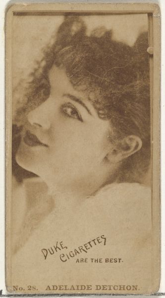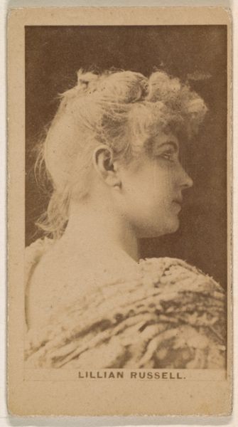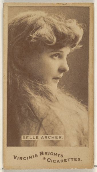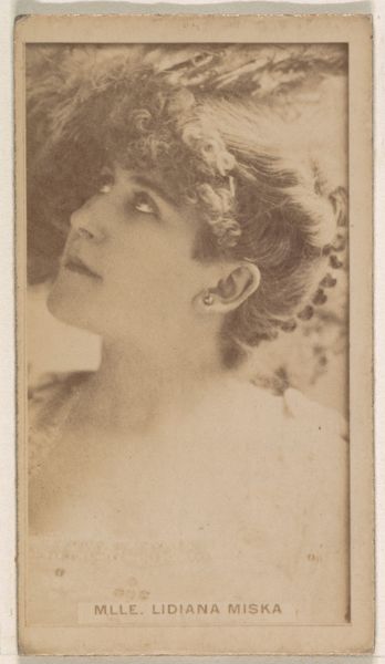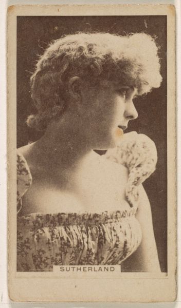 This is "Omene," a photograph from the "Actresses" series, created by the Kinney Brothers Tobacco Company as a promotional insert for Sweet Caporal Cigarettes. Produced during a period when the rise of mass media began to shape celebrity culture, this image exists at the intersection of commerce, art, and identity. The series reflects the increasing popularity of actresses as public figures, while simultaneously commodifying their images to sell tobacco products. Omene is presented in a soft, romantic style, a representation of feminine beauty that adheres to the aesthetic standards of the time. As we look at her, we might consider the dynamics of representation. How does the image contribute to the construction of an actress's identity? How does it reflect the gaze of the male consumer? What are the implications of linking female performers to products like cigarettes? Consider these questions as you reflect on the complex layers of meaning embedded in this small, yet culturally rich, artifact.