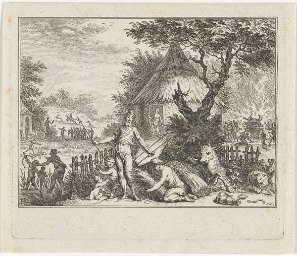 Curator: This line engraving by Franciscus de Bargas, titled "Landscape with Dancing Man and Woman and Bagpipe Player near Ruins," was created sometime between 1660 and 1699. It presents quite a scene. Editor: It does! It almost vibrates with frenetic energy. There’s a sense of playful chaos to the composition. It's not immediately clear where to focus. The dark and light areas push and pull you across the image. Curator: Indeed. De Bargas was working within the established tradition of genre scenes, catering to a market keen on depictions of everyday life, often romanticized or moralized. Consider how the ruins subtly juxtapose against the revelry. They hint at the passage of time and perhaps even the fleeting nature of joy. Editor: That juxtaposition you point out brings an element of the sublime to the seemingly carefree depiction of music and dance, infusing the image with tension and maybe even grief, challenging idealized notions of pastoral life. The very material of the work, an engraving, speaks to the accessibility of these images to a broad audience. It underscores a developing early democratization of visual culture. Curator: Precisely. Furthermore, the choice to include dancing peasants raises interesting questions about class and representation during this period. Who was consuming these images and what did they signify to them? Was it an appreciation of rustic life, or was it meant to be a form of satire? Editor: Or was it intended to simply romanticize it all? The gendering of labor also is quite visible with women appearing to actively enjoy folk life in direct correlation with masculine authority over instrumentation and performance. The lack of agency here really highlights cultural paradigms in need of disruption. Curator: The ambiguity itself makes the piece so compelling. This seemingly simple scene is pregnant with social and historical context. The landscape is as much a cultural construct as it is a natural one. Editor: This certainly provides plenty of fodder to investigate the intricacies of cultural representation through a feminist lens, while understanding broader societal impacts and potential power dynamics. Curator: It really is quite multifaceted isn’t it. It challenges us to delve beyond the surface to uncover the layers of meaning embedded in this Baroque landscape. Editor: Yes. Thank you for expanding my reading of de Bargas’ work!