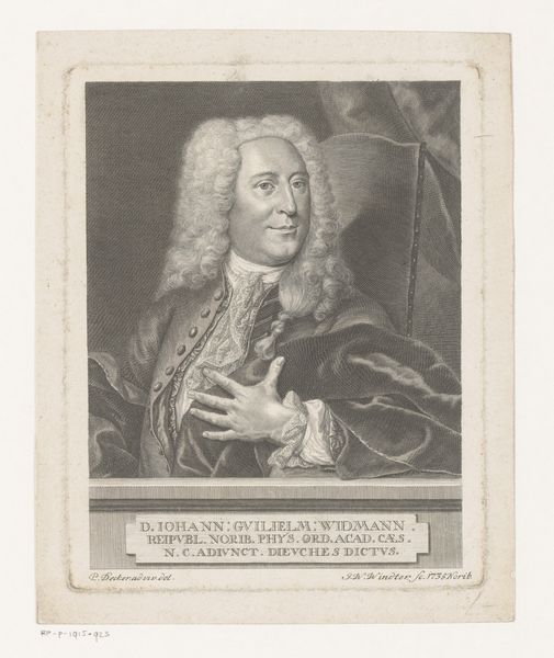 Editor: So, this is "Portret van Johann Wilhelm Widmann" from 1735. It’s an engraving. The detail is impressive, especially considering the limitations of printmaking back then. It's interesting how it's made to look like a painting through engraving, though. What does this print tell you? Curator: Well, it really speaks to the blurring of high art and craft during that period. The very act of reproducing this man's likeness via engraving implicates labor and production. Think about the skilled engraver, toiling to meet the demands of portraiture at the time. Do you consider who the engraver was versus who Widmann was? Editor: Good question! So, this engraving wasn't just about Widmann, but also the labour involved in making these kinds of prints accessible. I guess they were produced in quantity. Curator: Precisely. Engravings were a vital method for disseminating images, reflecting a burgeoning consumer culture. How does that knowledge change your perspective on the print's formality? Editor: It's interesting. The formality now seems less about Widmann specifically and more about a broader visual language. The process enabled making images that served both as displays of status and consumer objects. Curator: It is also worth questioning who purchased these, how were they traded, and what did owning this print represent to its contemporary viewers? Editor: I never really thought about the social reach beyond just a portrait and as more of a cultural item. Thanks, I see this piece so differently now! Curator: It's about understanding the material conditions of art production and the socio-economic context. And in this case, we see the engraving itself as an agent of social dissemination and material history.