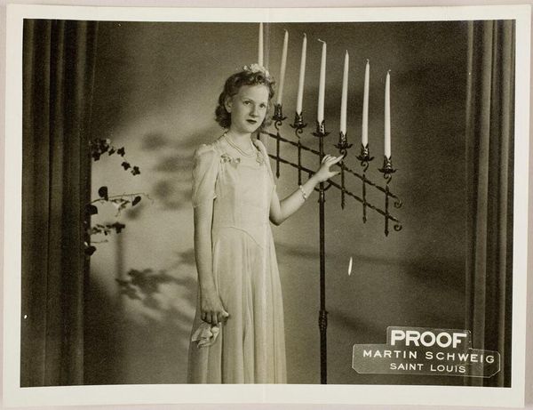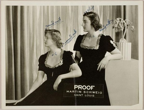 Editor: Here we have an undated studio portrait by Martin Schweig, featuring two young women in summer dresses. It feels very staged, and I'm curious about the social context. What can you tell me about this type of photograph? Curator: It seems to be a proof. The studio logo is prominently displayed. Portrait studios played a crucial role in shaping social identity and projecting aspiration, particularly for women entering adulthood. How do the women's poses and attire contribute to this sense of carefully constructed image? Editor: They seem elegant and poised, but maybe a bit stiff? Like they're trying too hard. Curator: Precisely. These studios provided access to a kind of idealized representation, influencing perceptions of beauty and social standing. It reveals how commercial interests and personal desires intersect in visual culture. Editor: That’s fascinating. I hadn’t considered the studio itself as an active agent in shaping the image. Curator: Thinking about the studio's role really shifts our perspective, doesn't it?
