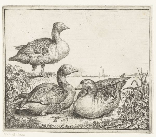 Curator: Before us is Wenceslaus Hollar's "Four Wading Birds," crafted in 1654. Editor: They look like characters from a whimsical fable. A touch fantastical, wouldn't you agree? Curator: Perhaps not entirely fantastical. Hollar was known for his meticulous detail, documenting the natural world. This etching, held by the Rijksmuseum, offers a fascinating look at how the 17th century perceived and categorized species. Editor: It is difficult to unsee the symbolism though; notice how each bird subtly embodies human traits. The stoic dignity, the inquisitiveness – were birds a common vehicle for allegorical social commentary back then? Curator: Indeed! The use of animals to mirror human behaviors was very common in satirical prints of the time, often revealing and questioning society’s mores and norms. Bird imagery was particularly relevant since birds symbolized freedom but were often kept in cages, which sparked questions around captivity and liberation, and their place in social hierarchies. Editor: Thinking of this through a more psychological lens, could these birds also represent different aspects of the self? Are they inner aspects standing together? Perhaps the birds could reflect contrasting temperaments within Hollar's own character. Curator: It’s possible. Remember the rising popularity of emblem books which encouraged visual metaphors for virtues and vices during that time. Hollar would’ve undoubtedly been aware of the symbolic language he was deploying, however intentional. The birds may not embody direct representations but instead convey more atmospheric feelings about intellectualism, freedom, the world, or the human condition, all current during this Age of Discovery and philosophical reevaluation. Editor: Whatever the motivation, they draw you into this tableau of observation and inner contemplation; the fine lines bring so much detail into the different expressions. Curator: A real testimony to Hollar's detailed technical skills in etching. Each line is thoughtfully placed! Editor: Agreed. An encounter to remember for certain. Curator: Absolutely; the convergence of detailed naturalism and symbolic weight renders them incredibly interesting and important!