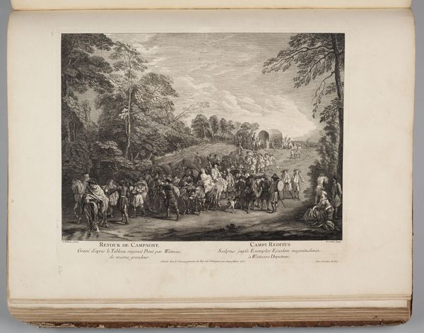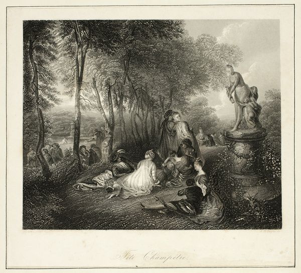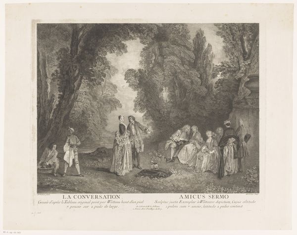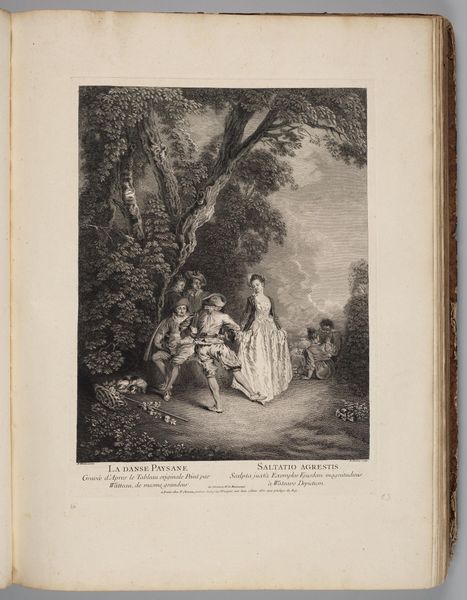 Curator: At first glance, this looks like a stage set, doesn't it? Very theatrical. Editor: Indeed! This is "The Bagpipe" by Jean Moyreau, currently residing in the Harvard Art Museums. It presents a scene of leisure, seemingly in a park. Curator: It strikes me how carefully staged the figures appear, almost as if frozen in poses. Considering the history of such depictions, I wonder what roles these individuals occupy within their social context? Editor: Well, images such as this served important purposes, documenting class and leisure pursuits. How were these kinds of images consumed and what purpose did they serve within the aristocratic visual economy? Curator: I'm struck by the tension between the apparent idyll and the underlying power structures at play. Editor: It certainly encourages us to question the narratives embedded within seemingly innocent portrayals of leisure. Curator: It leaves me contemplating the enduring relevance of these visual representations in understanding social dynamics. Editor: A valuable point to consider, given its display in the Harvard Art Museums.