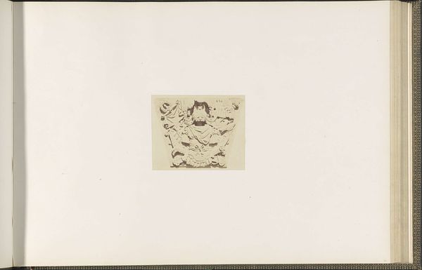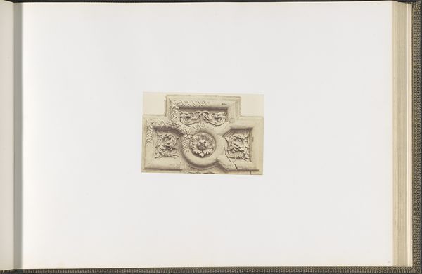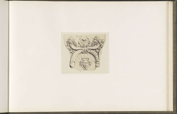Editor: So this is a photograph of the plaster model for a sculpture, “L’Etude,” or “The Study,” by François Gilbert, made around 1855 to 1857. It’s currently held at the Rijksmuseum. What strikes me is the symmetry, and how it uses classical motifs like cherubs. What else do you see here? Curator: What I find fascinating is the visual language being employed. Notice the cherubs—they are not merely decorative. They function as allegorical figures, symbols of innocence and inspiration. They frame the central cartouche, almost as if guarding knowledge. It makes me wonder about the specific patron or the institution it was designed for. The crown above further emphasizes power, perhaps intellectual authority? Editor: I see what you mean. The crown definitely adds a layer of authority. And the cherubs holding what look like writing tablets reinforce that connection to study and learning. But how would this fit within the Louvre’s historical narrative? Curator: Precisely! This is where history and symbolism intertwine. The Louvre, traditionally a palace, was evolving into a museum during this period, becoming a repository of knowledge. This sculpture, with its focus on "L'Etude," represents this transition, celebrating the pursuit of learning, making the palace a Temple of art and science, so to speak. Is the symmetry telling us something too? What sort of ideals did symmetrical and ordered composition hold at this moment in history? Editor: That’s a really insightful point. The symmetry could represent the desire for order and rationality during that period, right? I hadn't really connected those ideas. Curator: Yes, in a way, it’s an idealized version of enlightened pursuit! Thinking about that historical moment, the imagery takes on deeper significance, as collective memory and visual vocabulary can express something important about national ambitions in France. Editor: This has really changed how I see this piece. Thanks! Curator: And thank you, this has illuminated what this sculpture tells us about ambition and its celebration.