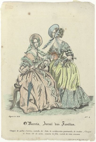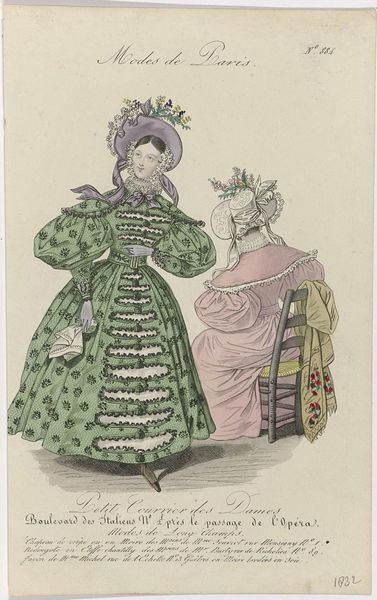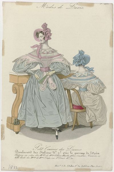 Editor: This is “Beauties” by Thomas Rowlandson, possibly from 1792. It's an etching and colored-pencil print showing two women, each in a ridiculously large hat. I find the juxtaposition interesting…there's a certain humor, but also something critical about their social position, maybe? How do you interpret this work? Curator: That's a perceptive observation. Rowlandson was a master of social satire. What strikes me is the performance of femininity here, especially through these exaggerated fashions. These aren't just portraits; they're caricatures that critique the societal pressures placed on women to embody idealized beauty standards. Editor: So you're saying these women aren’t just individuals, but representatives of something bigger? Curator: Precisely. Consider the French Revolution, unfolding at the same time. Rowlandson’s work often lampoons the excesses of the aristocracy. Might these exaggerated hats be a visual metaphor for the frivolous spending and preoccupation with appearance that characterized the elite, while the lower classes struggled? How do you think the coloring and lines contribute to this commentary? Editor: The colours do seem quite artificial, and the lines are definitely sharp and a little cruel... it almost makes them look like puppets. That would add to the sense of them being trapped by society. Curator: Exactly. The print's folk-art style also suggests the democratization of art during that time. These images were made to be consumed by a wide public, fostering discourse. This gives these "beauties" social power but at a cost. Editor: That makes me see the artwork completely differently. Thank you! Curator: And thank you! It’s through such dialogues that we unravel the complex layers of meaning embedded in these seemingly simple images.