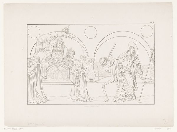 Editor: Here we have "Kostuums," or "Costumes," by David van der Kellen, created before 1878. It’s a pencil and etching drawing, almost like a glimpse into another time. I find the lack of color makes it feel distant, like a faded memory. What's your take? Curator: You know, I'm immediately drawn into the detail. Despite its monochrome simplicity, this piece vibrates with a keen observation of social life, a theatricality. Look at how Van der Kellen captures the various interactions. Can you see it's almost like a stage set? I wonder, what is the 'play' about? Is it dinner, business, a rendezvous of some kind? Editor: It's interesting you mention theater. It does have that staged feeling. What strikes me is the precision. Every line feels intentional. What do you think it reveals about the artist’s intentions? Curator: Ah, the beauty of intent. I believe Van der Kellen wasn’t simply documenting clothes, but capturing character, aspiration and status – and isn’t that what costume is *always* about? These people could be anybodies if divested of their dress and surrounding context. Van der Kellen is capturing a world, or more likely, a *desire* for a world, an ambition for social grace, through attire and setting. What feeling do you get from those gathered at the table? Editor: I hadn't considered the aspirations that vividly, I was so focused on the drawing technique! At the table, I sense almost a formality... perhaps slightly awkward interactions. Now, it's difficult to unsee what you highlighted, costume as performance, the layers of meaning woven in. Thank you. Curator: Isn’t that the joy of really *seeing*? I am thrilled you are seeing it in this piece!
