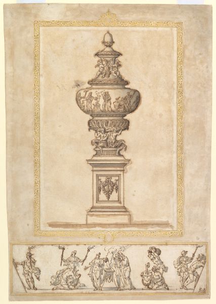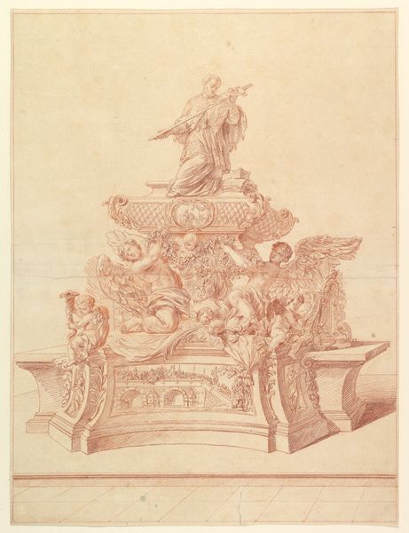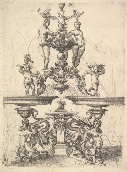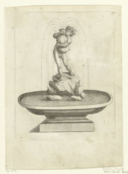 This drawing, "Copy after Giambologna's Neptune Fountain in Piazza San Petronio, Bologna," was created by an anonymous artist using pen and brown ink. The drawing presents a study in the contrast between linear precision and spatial depth. Notice how the architectural elements of the fountain are rendered with geometric accuracy, emphasizing a rational structure and highlighting the layered composition of its tiered base. The use of brown ink gives a monochromatic warmth, while the careful shading suggests volume and texture. However, within this order, the artist introduces dynamism through the statue of Neptune and the surrounding figures. There is a tension between the static architectural form and the lively sculptural elements which destabilizes the traditional perception of fountains as mere decorative objects, suggesting a more profound engagement with classical motifs and civic identity. Ultimately, this drawing operates as a semiotic device, encoding cultural values through its formal qualities, while also inviting us to question the relationship between representation and reality.