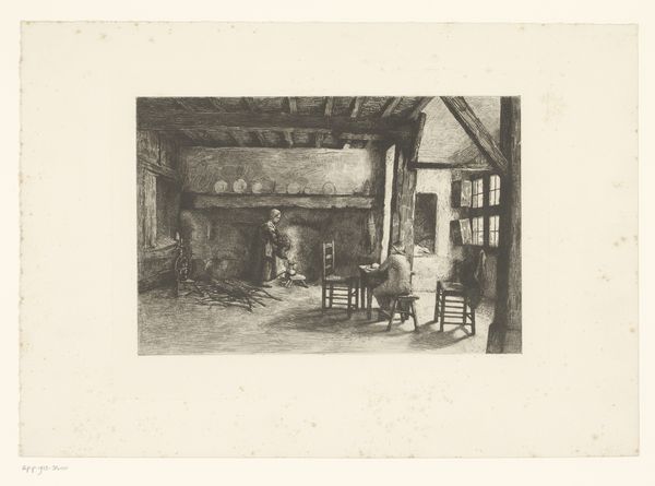 Curator: This etching is entitled "Kloostergang van het hospitaal te Lier met zusters bij een put," placing us in the cloistered courtyard of a hospital in Lier, Belgium, sometime between 1851 and 1909, the period in which Théodore Joseph Cleynhens was producing his works. My initial response is a deep sense of quietude and contemplation; the monochrome palette reinforces the hushed atmosphere of labour. Editor: Indeed. You immediately feel the weight of labor through Cleynhens’ medium: print. He has translated daily activity of nuns near this hospital, showing the materiality of life and its social texture. Curator: Yes, and that labour is undeniably gendered and very specific to religious women, to nuns living in this highly prescribed architectural space. It offers a glimpse into their lives and the important work they would have carried out. Editor: I see it as an illustration of social structures, showing the materials from their labour. Look at the water from the well, the stone making up the well itself, or the textile in the wash basin: we’re meant to observe their process, one that repeats constantly and is essential for sustaining communal life. Curator: Absolutely. The etching style, with its fine lines and delicate shading, adds to the sense of austerity and humble dedication, something reinforced by the figures and architecture. There is beauty and humanity there in this work, but so much implied structure. What kind of politics are at play? Editor: Good question. We are seeing social hierarchy at work, with humble actions represented as critical processes, and not so hidden behind gendered labour: they must work for the convent's sustainability and the well-being of its patients. There's an important link being made here between work and community that should not be missed! Curator: Reflecting on this etching, I’m struck by how it connects art, religion, labour and societal position: the constraints and confines, even. This is far more than just a picturesque scene; it is an important historical marker. Editor: And for me, its power resides in illustrating daily actions by portraying both structure and materials, suggesting an ecosystem between these nuns, architecture and manual labor. It leaves a tangible effect long after they’ve completed their work.