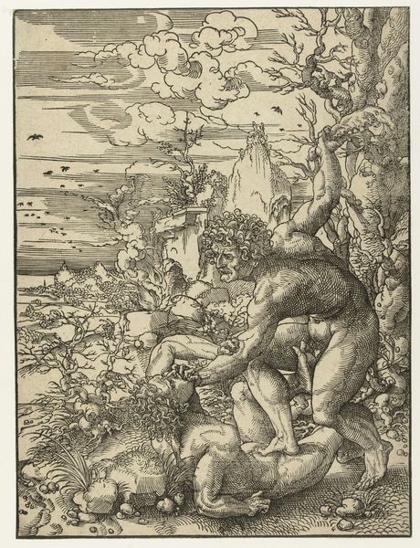 Curator: Welcome. We're looking at Heinrich Aldegrever’s “Creation of Eve,” an engraving completed in 1541, currently held at the Rijksmuseum. Editor: It’s starkly dreamlike, isn't it? The density of the lines creates a hazy, almost unreal atmosphere around a very classical scene. The bodies seem frozen in this etched twilight zone. Curator: Indeed. Observe how Aldegrever uses line alone to define form and space. The minute variations in the density and direction of these lines skillfully model the figures and objects, giving them a tangible, almost sculptural presence despite being rendered in two dimensions. Note especially the detailing on God’s robes and beard. Editor: But it’s not just a display of technical skill. I think it reflects the anxieties about female agency present during the Reformation. Eve's quite literally extracted from Adam, an act that seemingly defines her as secondary, even subservient. This artwork speaks to how gender roles were being reimagined, often regressively, amid religious upheaval. Curator: Your point highlights a tension: Aldegrever meticulously constructs the composition according to established conventions, presenting Eve as emerging directly from Adam's rib. However, notice the assertive, almost geometric division of the space, with the looming tree as an iconic marker in the composition. Editor: That apple tree is certainly impossible to ignore. It hangs heavy with implications. Eve's creation, shown here as this passive birth, is inexorably tied to the fall. It’s almost a pre-ordained narrative, a consequence embedded at the moment of her very existence. What does the serpent not included within the creation imply about an existing evil preordained to find her? Curator: Ultimately, Aldegrever's command of line and form creates a rich visual experience. Editor: Agreed. Through careful attention to the composition, we reveal a narrative that explores themes of creation, gender, and power. Thank you for your observation today.