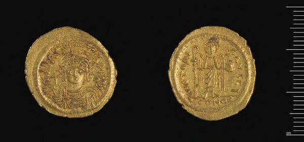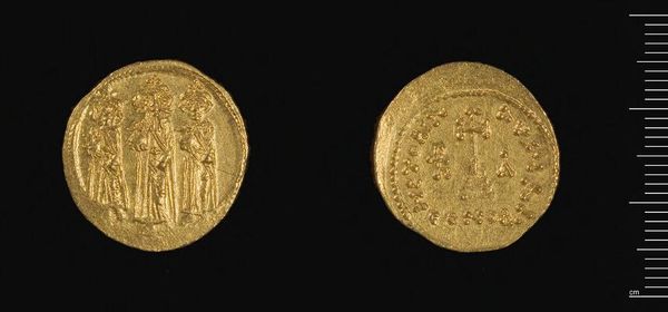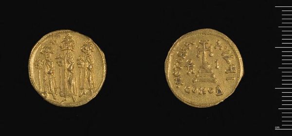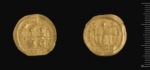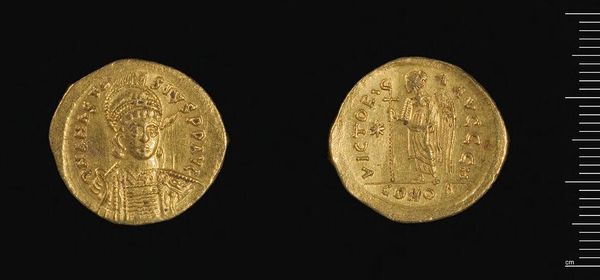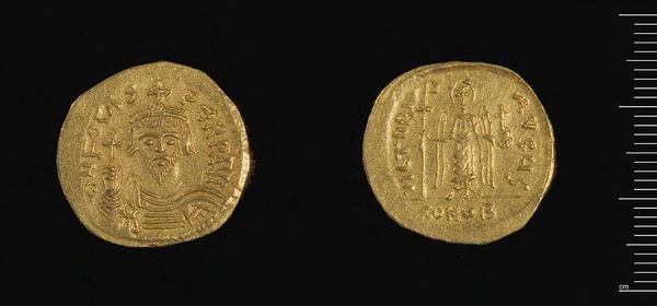 Editor: Here we have a golden coin featuring Constantine X. It's amazing to think of it changing hands centuries ago! I find the imagery quite commanding. What story do you think this coin is trying to tell us? Curator: Oh, it whispers tales of power and faith, doesn't it? The Emperor, rendered in shimmering gold, quite literally embodies wealth and authority. I always imagine the craftsman’s hand, carefully etching the details, knowing their work would be seen, valued, and held for ages. It's a beautiful, enduring message. Editor: So, it's not just currency, but also propaganda? Curator: Precisely! A pocket-sized power statement, designed to impress and legitimize the reign. Makes you wonder about the weight, both literal and symbolic, it carried, doesn’t it? I wonder, could we accomplish that with a bitcoin today? Editor: Definitely given me something to think about! Curator: Indeed! Art that makes you ponder the past and question the present—that's the magic, isn’t it?