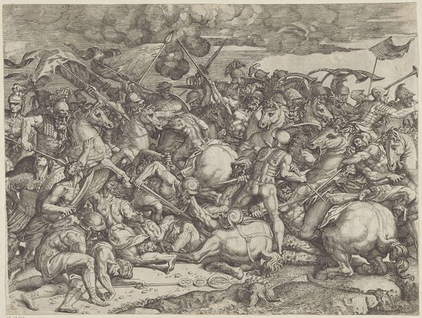 Curator: This is Plate 10: The Fall of Jericho, from ‘The Battles of the Old Testament’ created by Antonio Tempesta between 1585 and 1615. The artwork, housed here at the Met, is an engraving. Editor: The density of the lines immediately conveys a chaotic energy—a whirlwind of combat rendered in monochrome. It feels almost claustrophobic. Curator: Indeed. Observe how Tempesta employs incredibly fine lines to construct both depth and drama. The composition, though dense, reveals a calculated arrangement of figures and architectural elements. Note the rhythmic repetition of curved forms in the soldiers' bodies and the city walls. Editor: This depiction is more than just formal exercise, it reveals the ruthless logic of conquest. Jericho, the city breached, isn’t merely a backdrop; it is the object of complete and utter devastation. One might ask if it intends to highlight how structures of power rely on brutal methods. The bodies in the foreground present death, despair, and a vivid material record of conflict. Curator: Precisely. The Mannerist style is quite evident, evident in the elongated limbs and the dramatic poses of the figures. Look closely at the armor detailing. It suggests a celebration of military prowess. Editor: And also an implicit endorsement, or at the very least, a normalized depiction of extreme violence legitimized by religious mandate. This reading is essential; art seldom exists in a vacuum, removed from the moral ambivalences of the historical moment in which it came into being. It makes you wonder whether the piece was perhaps functioning as propaganda or whether its primary aim was documentation? Curator: Your reading acknowledges those complexities. For me, it reveals a clear emphasis on structure and artistic skill. The technical achievement—the sheer virtuosity of the engraving—is undeniable. Editor: Ultimately, Antonio Tempesta’s print confronts us with uncomfortable realities—religious fervor and historical violence are woven tightly into its formal artistry. Curator: I concede that this interpretation provides insight into the historical impact.