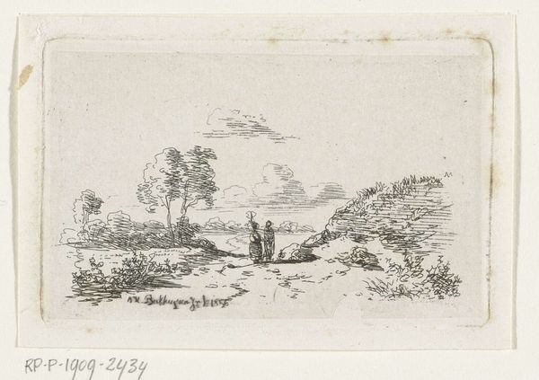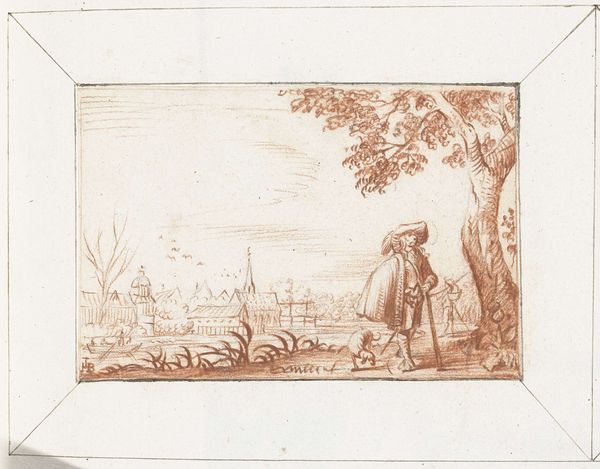 This drawing, "Man met een mand in een landschap," was made by Harmen ter Borch, likely in the mid-17th century. Executed in pen and brown ink, the artwork immediately presents a pastoral scene, dominated by the monochromatic brown that unifies the diverse elements into a cohesive visual experience. The composition is structured around a central tree, its form acting as a vertical anchor against the expansive landscape. The scene includes a man with a basket, set against a backdrop of distant buildings and fields. Ter Borch’s technique employs a delicate balance of detailed linework and open space. This creates a sense of depth within the limited dimensions of the work. Consider how Ter Borch uses line to define form and space, how texture is evoked through varying densities of strokes, and how the subtle tonal variations suggest light and shadow. The use of brown ink unifies the composition. It invites us to consider the semiotic interplay between figure and ground. This allows Ter Borch to engage with prevailing cultural discourses about nature, labor, and the human condition.