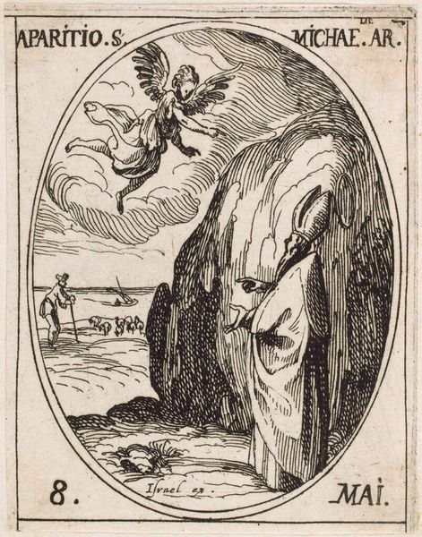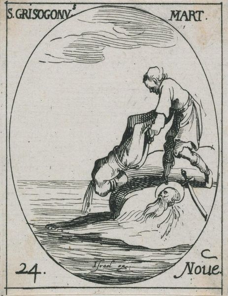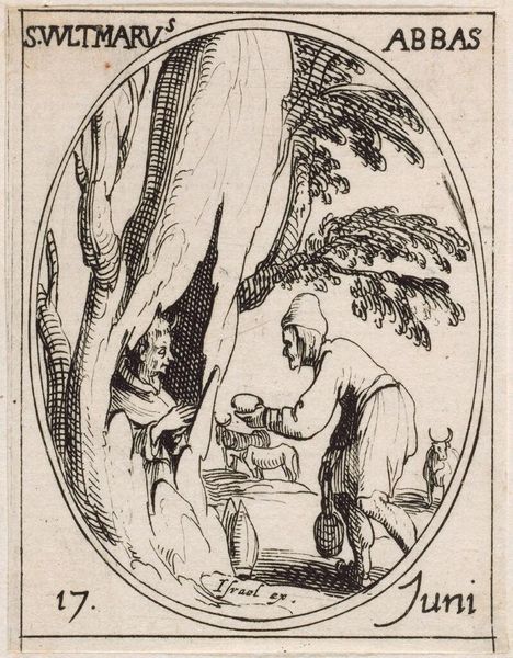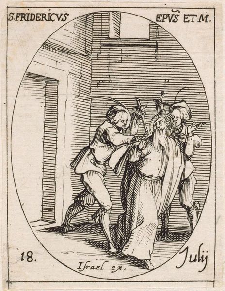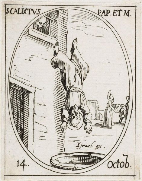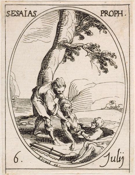 Editor: This etching by Jacques Callot, "Saint Pantalonius," depicts the saint's martyrdom. The starkness of the lines against the small scale makes the scene feel both intimate and brutal. What do you see in this work? Curator: Well, consider the material conditions. Callot, a master printmaker, likely used metal plates for these small, reproducible images. This speaks to the circulation of religious narratives as commodities, disseminated widely through printmaking. Editor: So, it's not just about the religious story, but about the means of spreading it? Curator: Precisely. And think of the labor involved: the meticulous engraving, the printing process, the distribution networks. The image itself becomes a product of early modern commerce. Editor: That's fascinating. I never considered the business aspect of religious art like this before. Curator: Examining the production reveals so much!