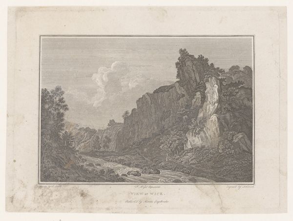 Curator: Here, we have Jacques Bacheley's "Gezicht op Italië," created in 1757. This enchanting piece is rendered as an etching and engraving. Editor: Oh, Italy, viewed from afar! It's incredibly charming, but I get a distinct melancholic vibe. Like a dream viewed through aged lace. The scene feels staged, doesn't it? Curator: Interesting. Formally speaking, observe how Bacheley meticulously structures the composition. The division between light and shadow, particularly in the cliffs and the bodies of water, guide our focus, and that use of contrast surely serves to elevate its intrinsic beauty. The scale feels intentional, emphasizing the dominance of the land over mankind. Editor: Yes, you see the imposing land—I see the subtle comedy in it. Tiny people herding sheep with exaggerated importance beneath the romantic ruins and dramatic clouds. Like actors in a theatre—posing in contrast to the natural splendor of this gorgeous location. A faint critique of humanity perhaps? Curator: Such interpretations might dilute the understanding of his formal intent, but perhaps. Consider how the medium of engraving lends itself to linearity and precision, shaping the entire artwork into a network of distinct forms, rather than dissolving into one homogenous vista. Editor: Indeed, but look at that detail on the sheep and the distant architectural flourishes – those imperfections! The rough edges against that clean line; it is that juxtaposition which captures my imagination. What if we look for hidden patterns, codes that echo Bachley’s soul, and that's where its true beauty comes shining through. Curator: It is, I confess, a delightful interpretation that adds another facet to its timeless appeal. A successful intersection of form and the unfathomable touch of something truly original, perhaps even immortal. Editor: Precisely. A testament to seeing the familiar with newly inspired eyes.